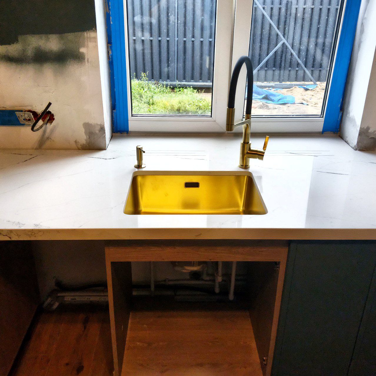 Золотая мойка, подобная изящному ювелирному украшению, эффектно выделяется на фоне белоснежной кварцевой столешницы, создавая элегантный акцент, который придает всему интерьеру ощущение утонченной роскоши и теплоты.