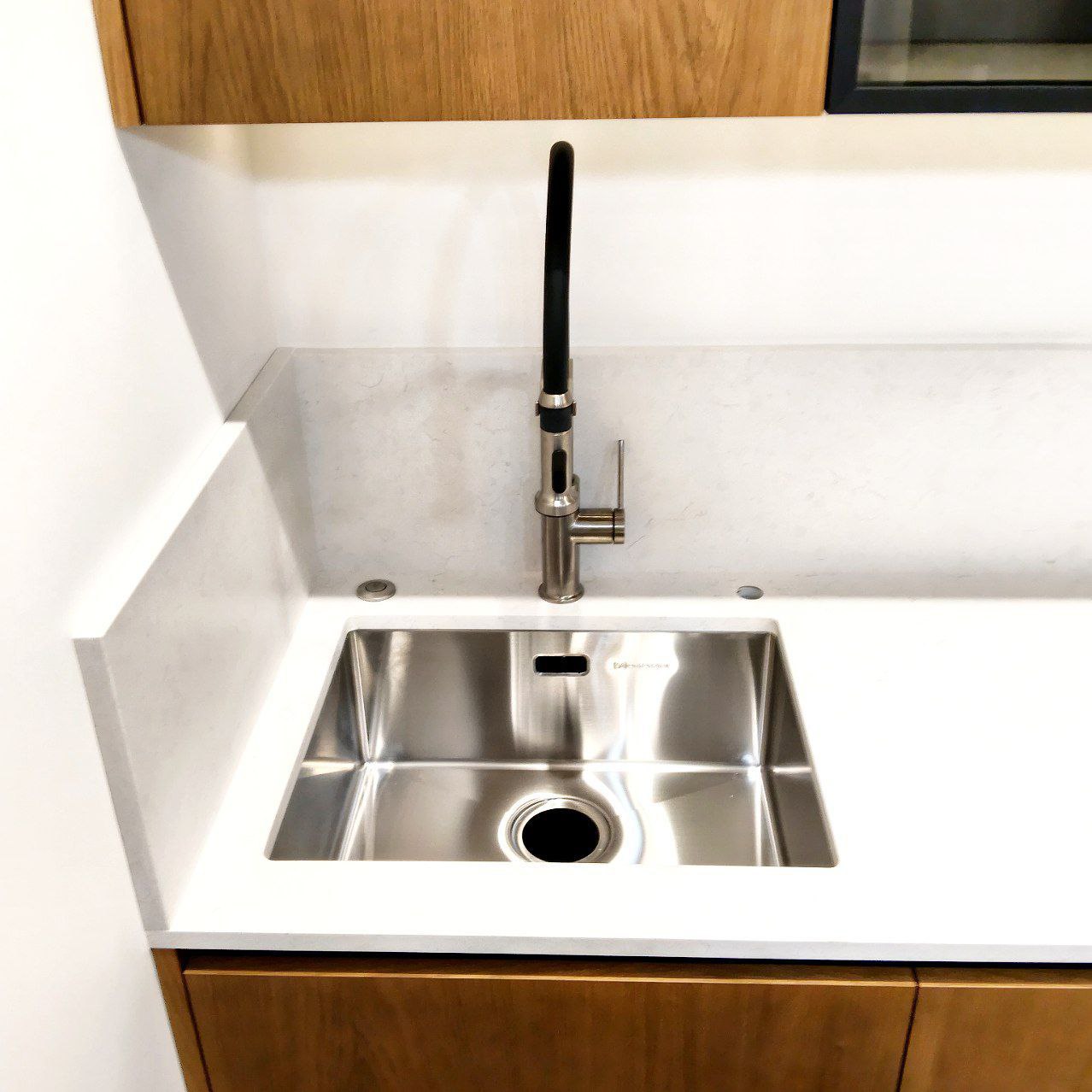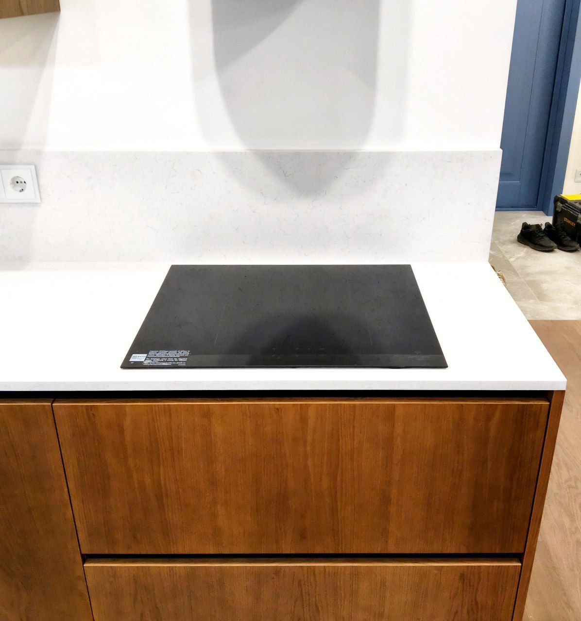 - Компактный фартук из того же кварцевого агломерата с вырезами для розеток обеспечивает единство стиля.