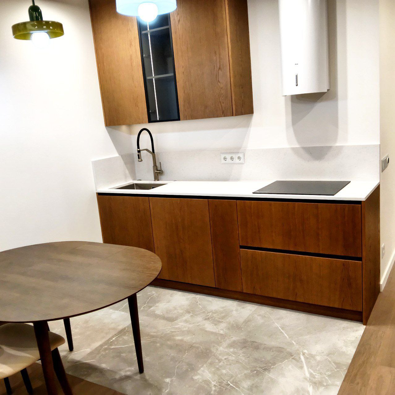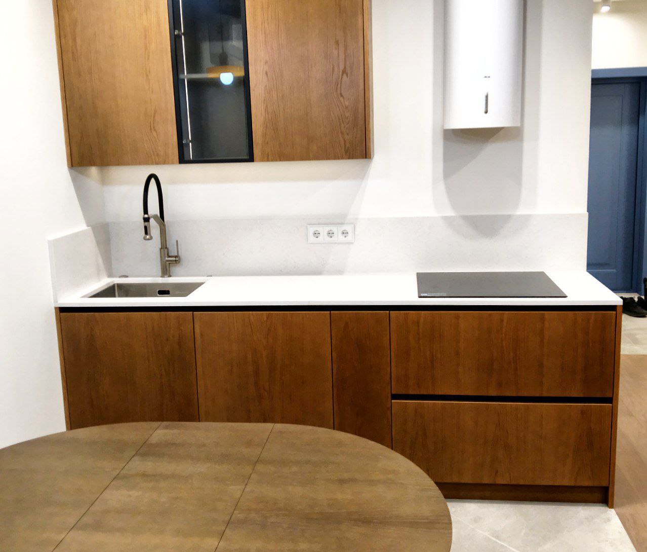 Белая матовая столешница и деревянные фасады