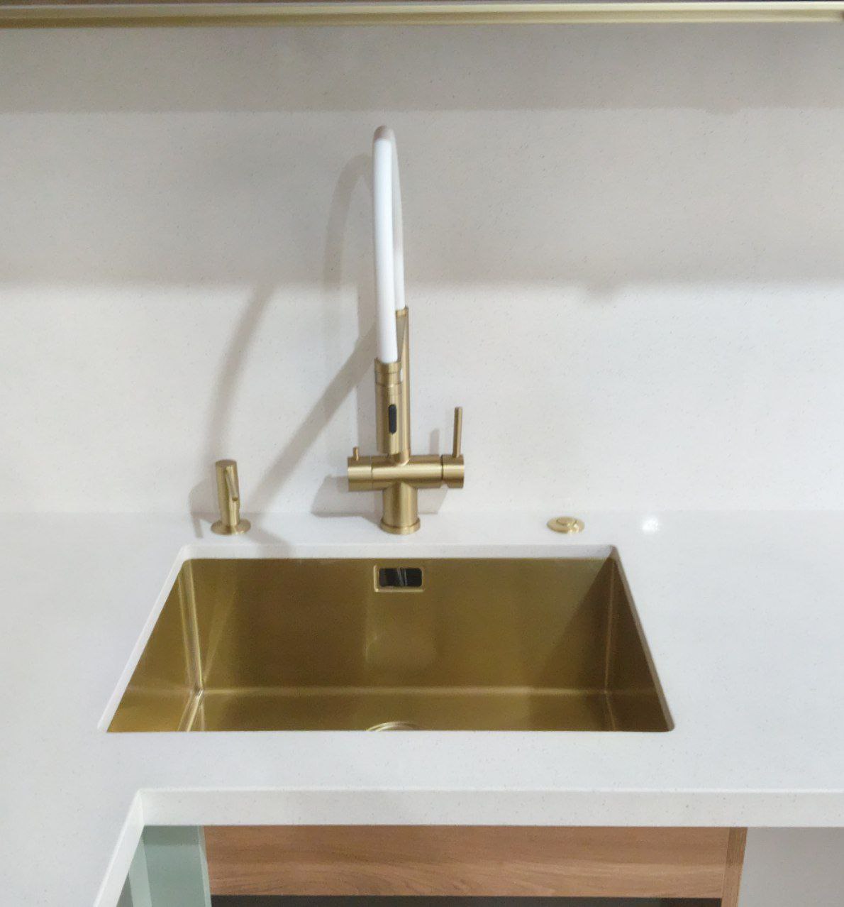 - Золотой кран над мойкой перекликается с другими металлическими элементами в отделке, объединяя композицию.