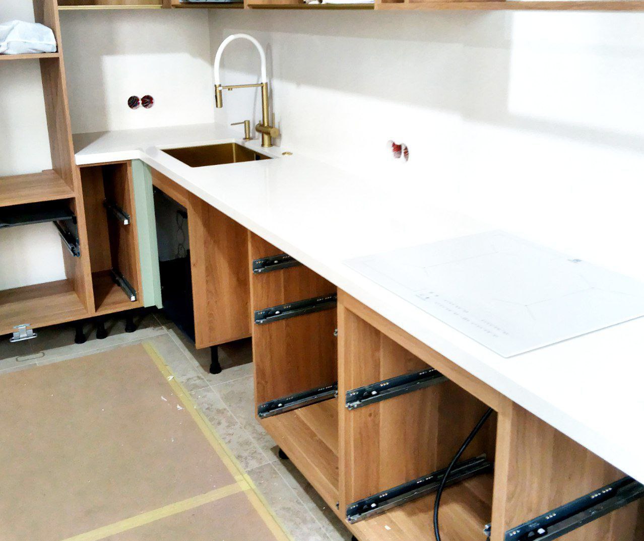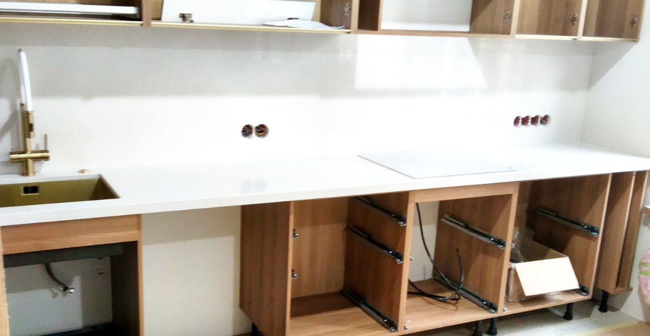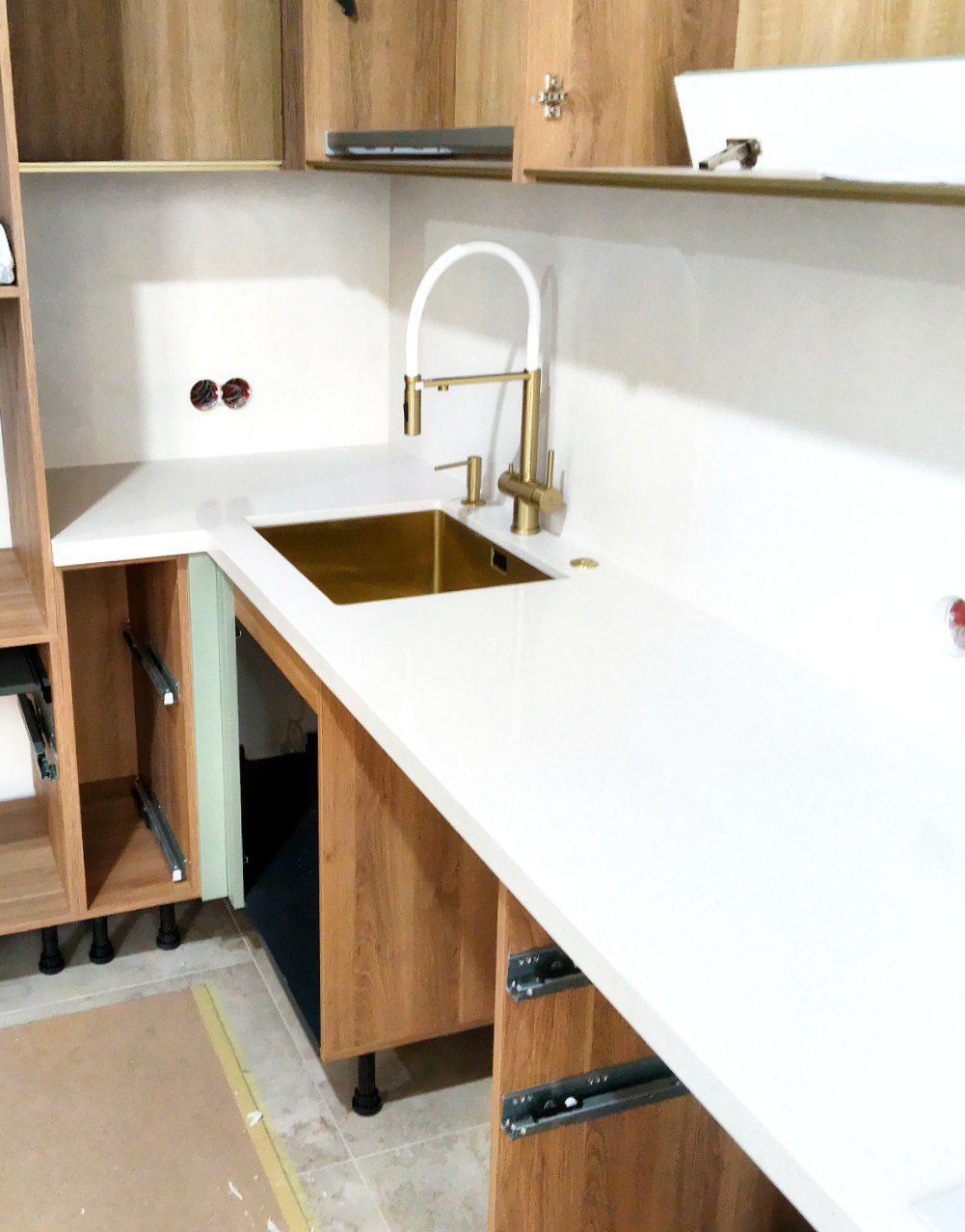 Кухня приобрела индивидуальный и завершенный облик, где каждое решение работает на создание гармоничной и уютной атмосферы. Сочетание белого кварца, натурального дерева и золотых акцентов доказало свою универсальность, позволив создать пространство, которое одновременно выглядит современно и наполнено теплом. Проект демонстрирует, как продуманный подбор материалов и деталей превращает стандартный кухонный гарнитур в выразительный элемент интерьера.