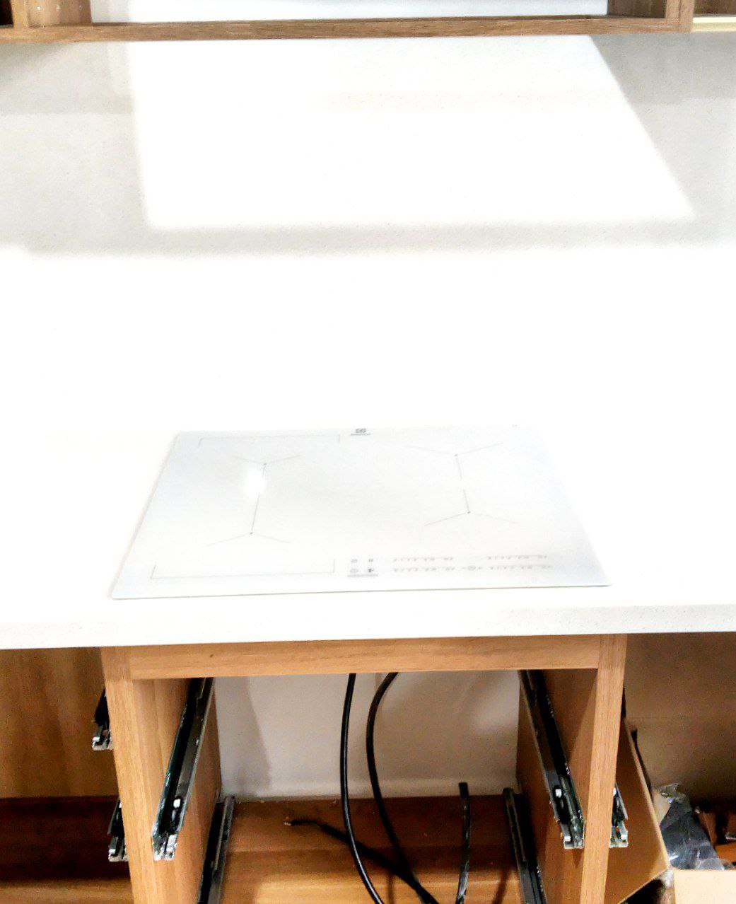 - В столешницу интегрированы мойка и электрическая плита, сохранившие гладкость матовой поверхности.
