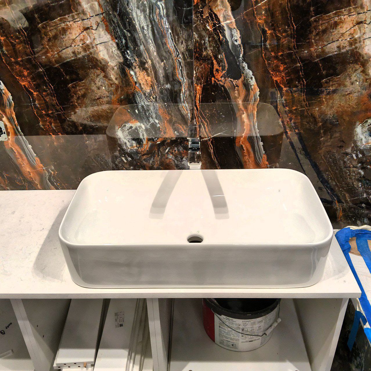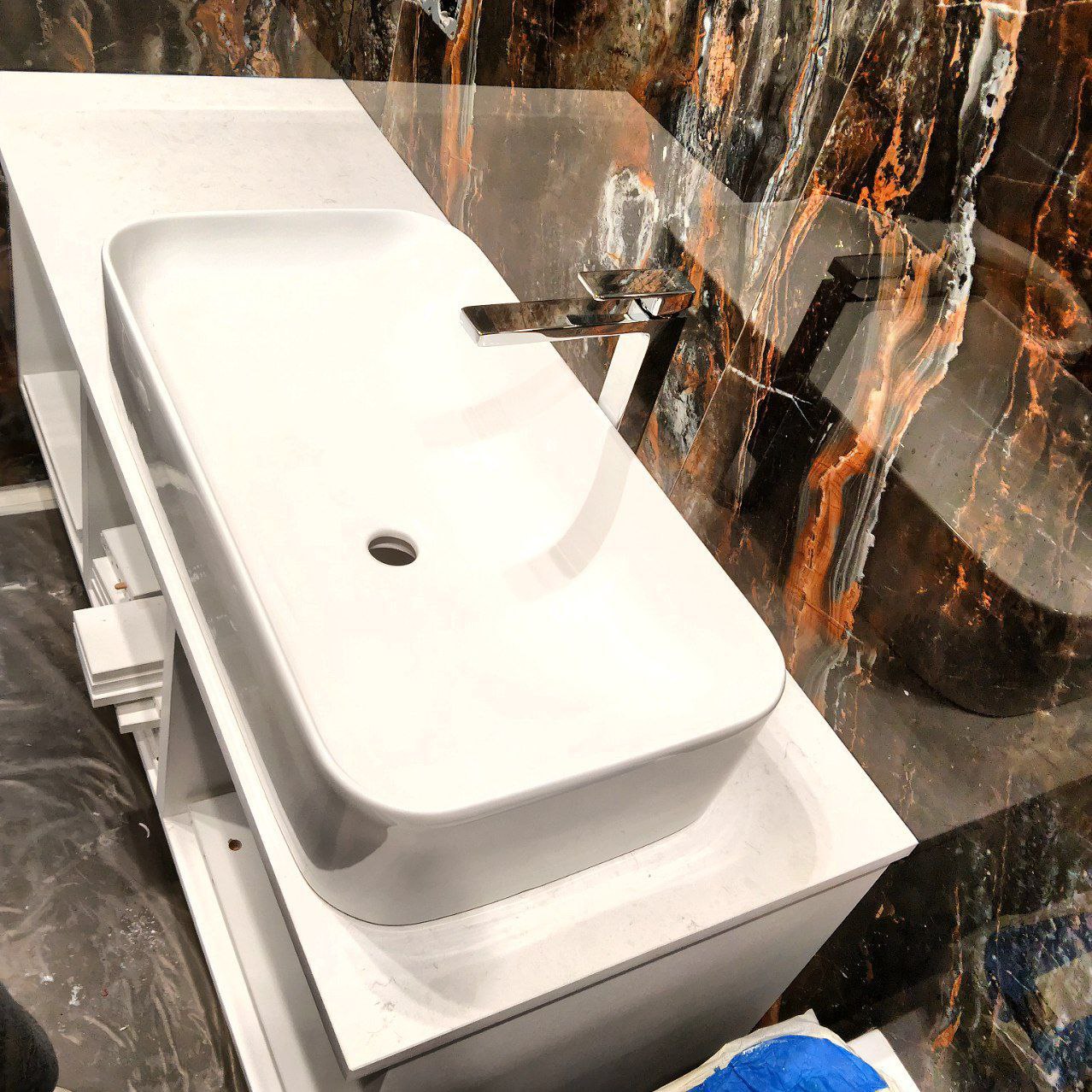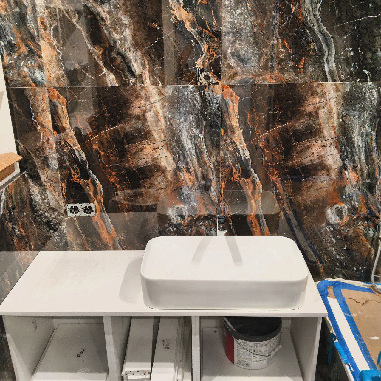 Ванная комната преобразилась, продемонстрировав, как контрастные решения могут создавать гармоничный и стильный интерьер. Белая кварцевая столешница не только органично сочетается с массивной мойкой, но и выигрышно смотрится на фоне темной орнаментной плитки, подчеркивая ее богатство. Проект подтвердил, что даже в небольшом помещении можно достичь баланса между сдержанной элегантностью и яркой художественностью.