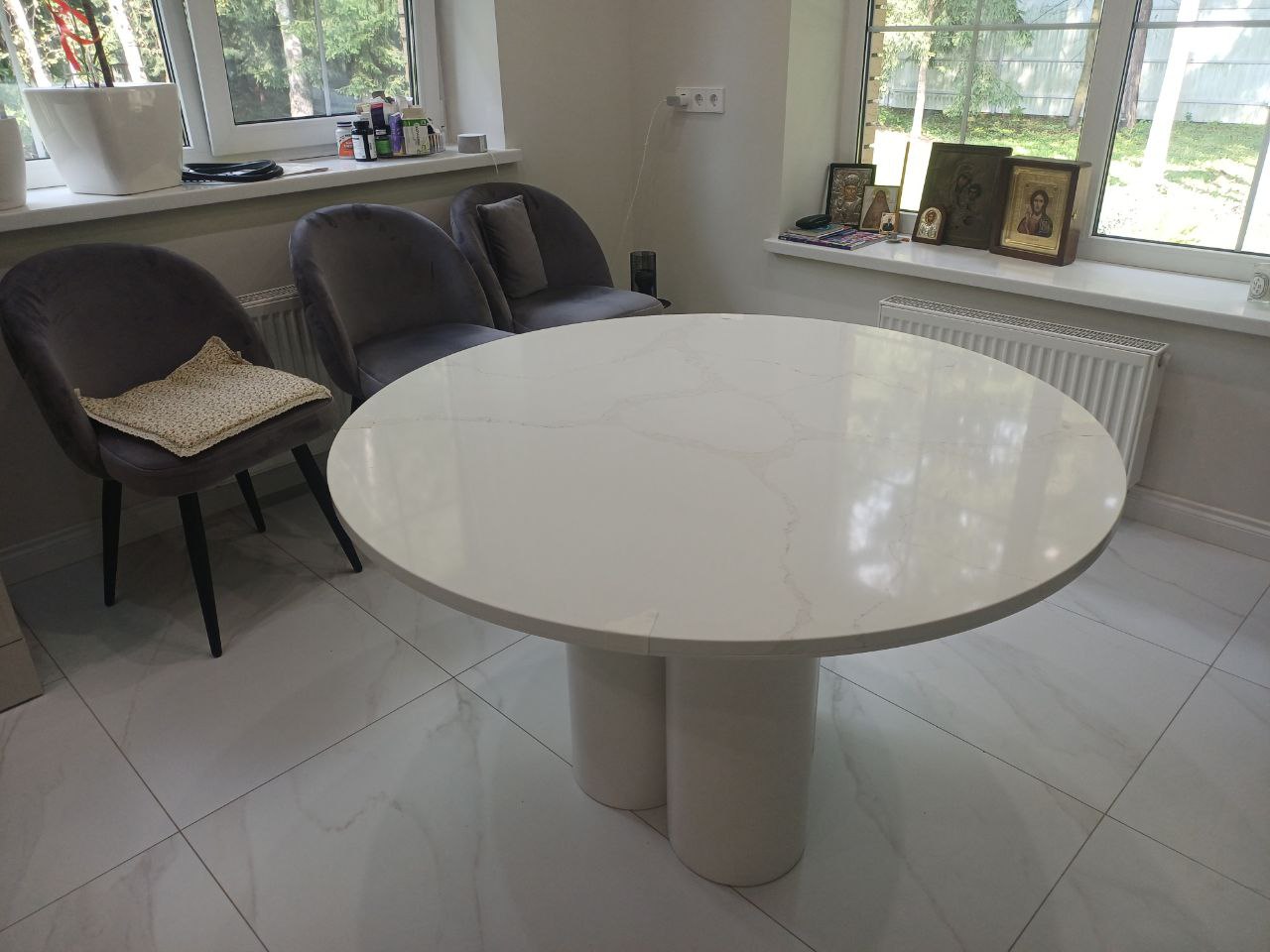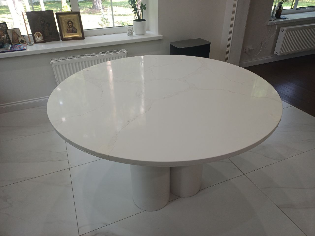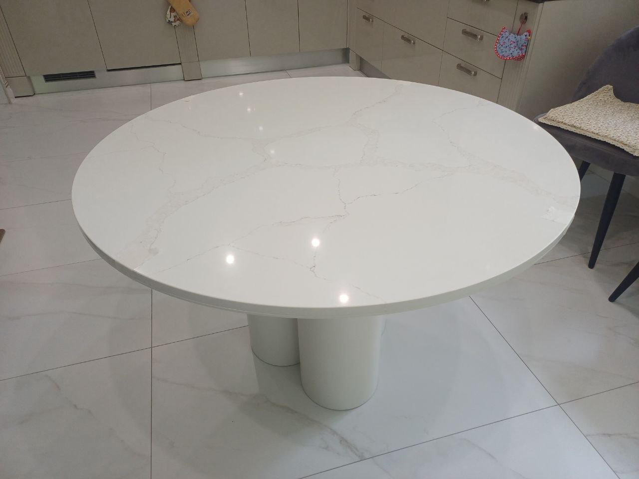 Идеально круглая форма и чистейший белый цвет создают ощущение гармонии и завершенности. Столешница служит стильным акцентом, не перегружая пространство, и легко сочетается с любым интерьерным стилем.