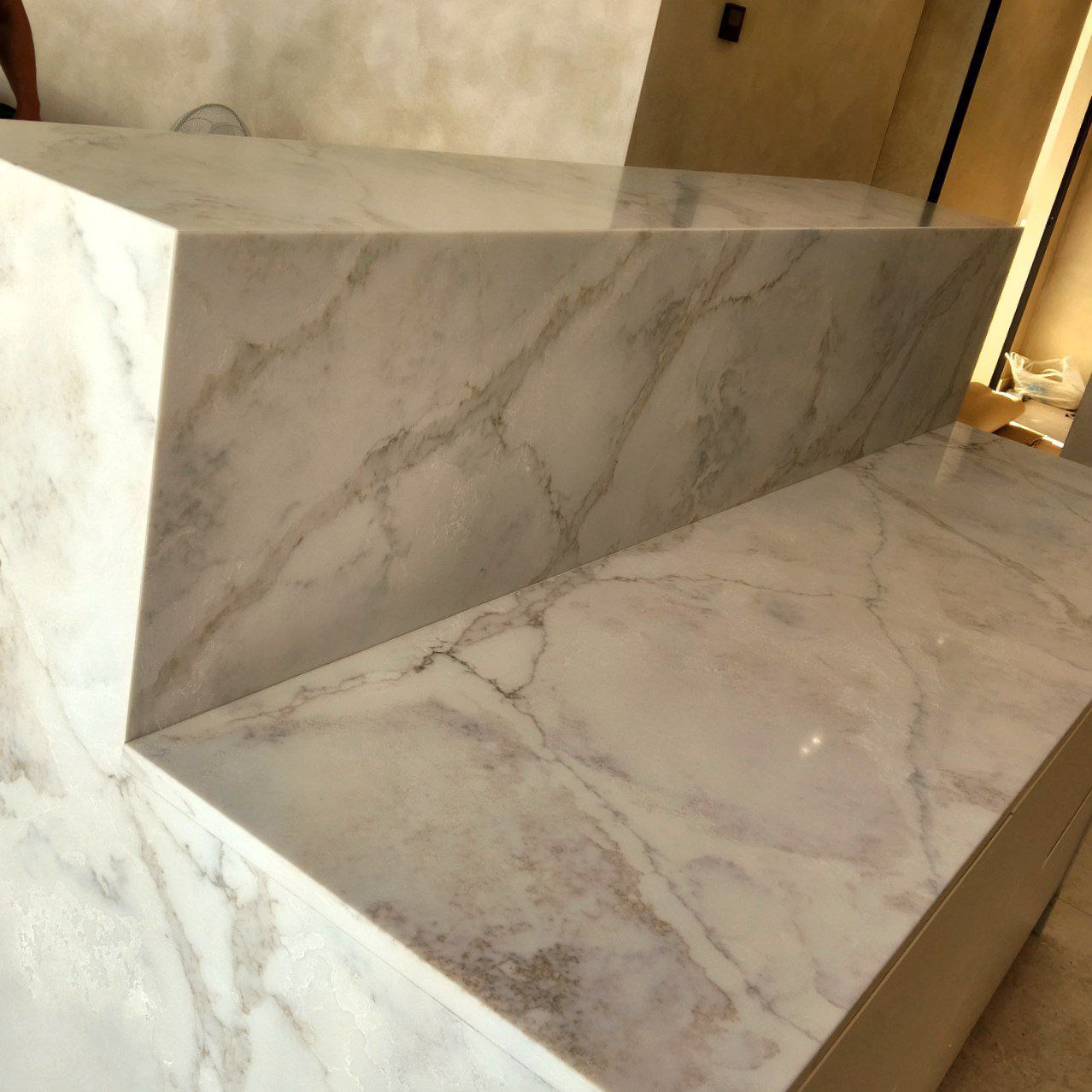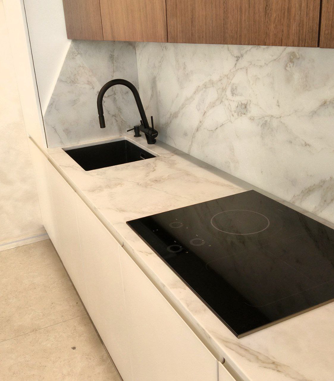 - Повторяющийся рисунок Calacatta обеспечивает стилистическую связь с основной рабочей поверхностью.