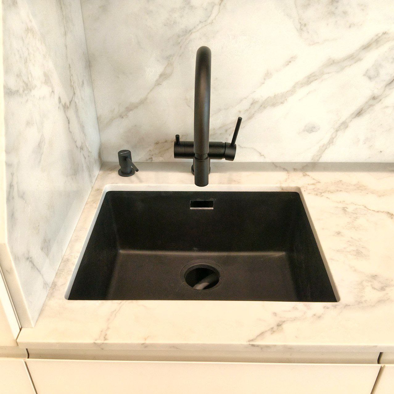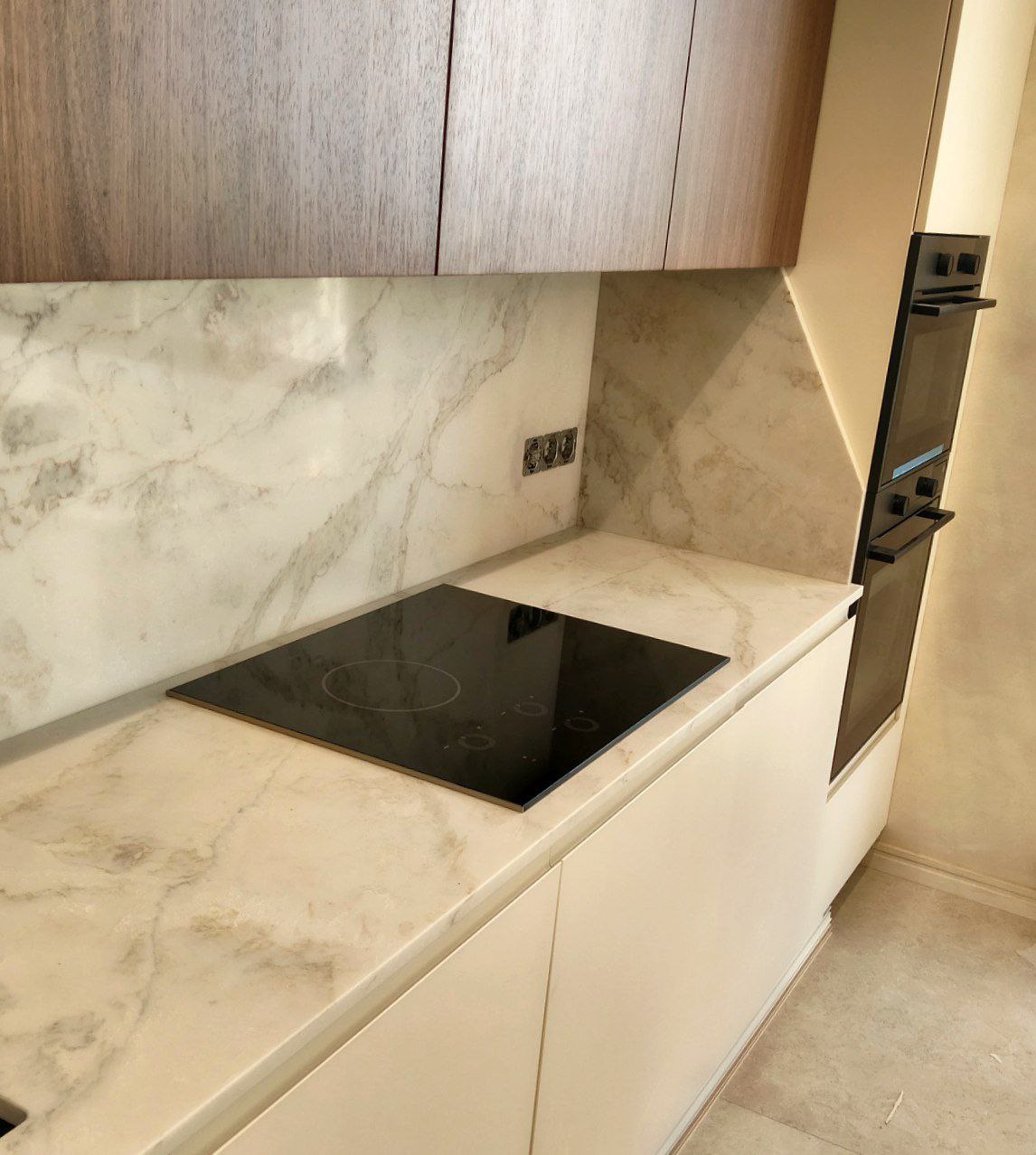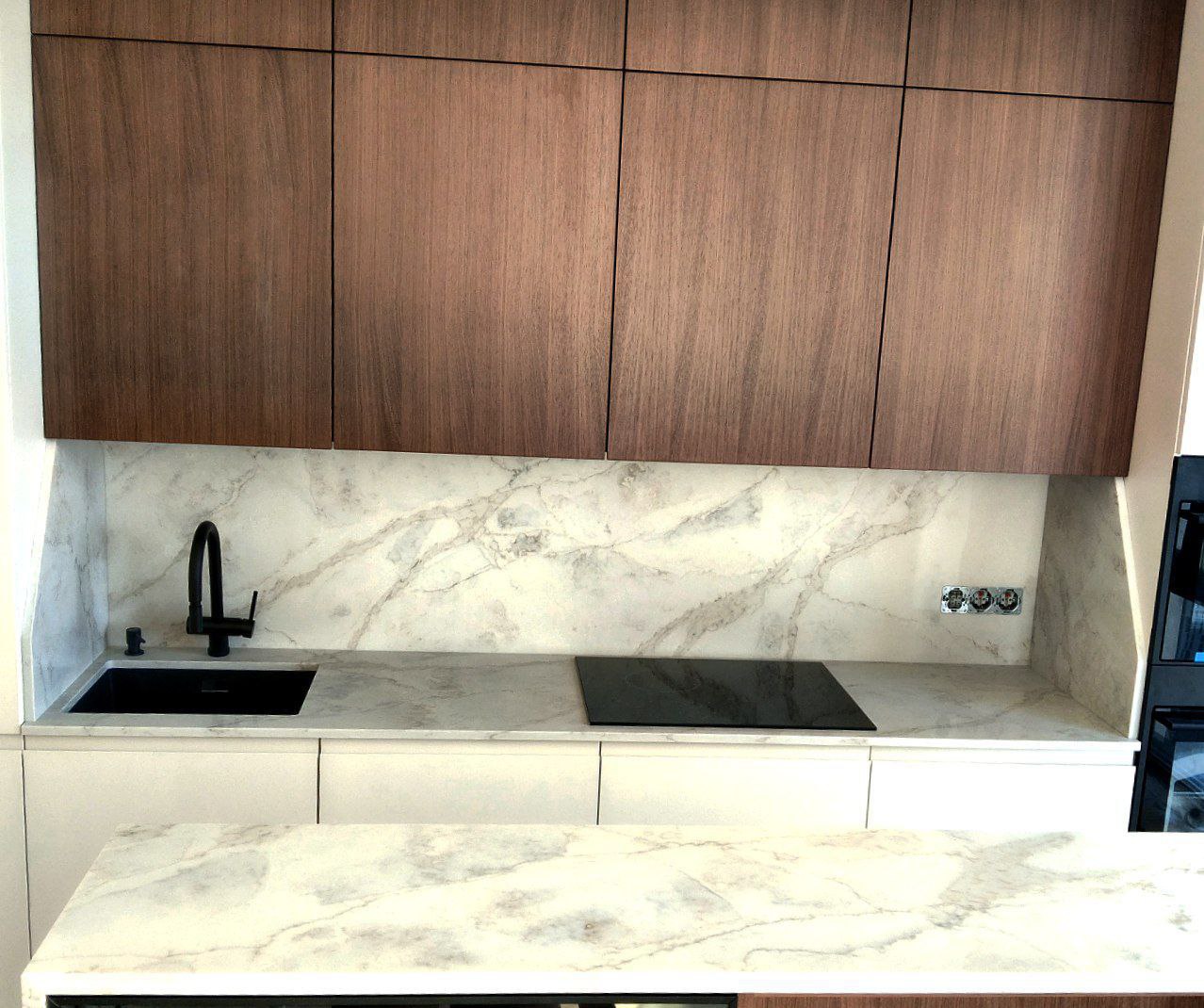 - Фартук из того же кварцевого агломерата оборудован точными вырезами для розеток, обеспечивая эргономичность и завершенность внешнего вида;