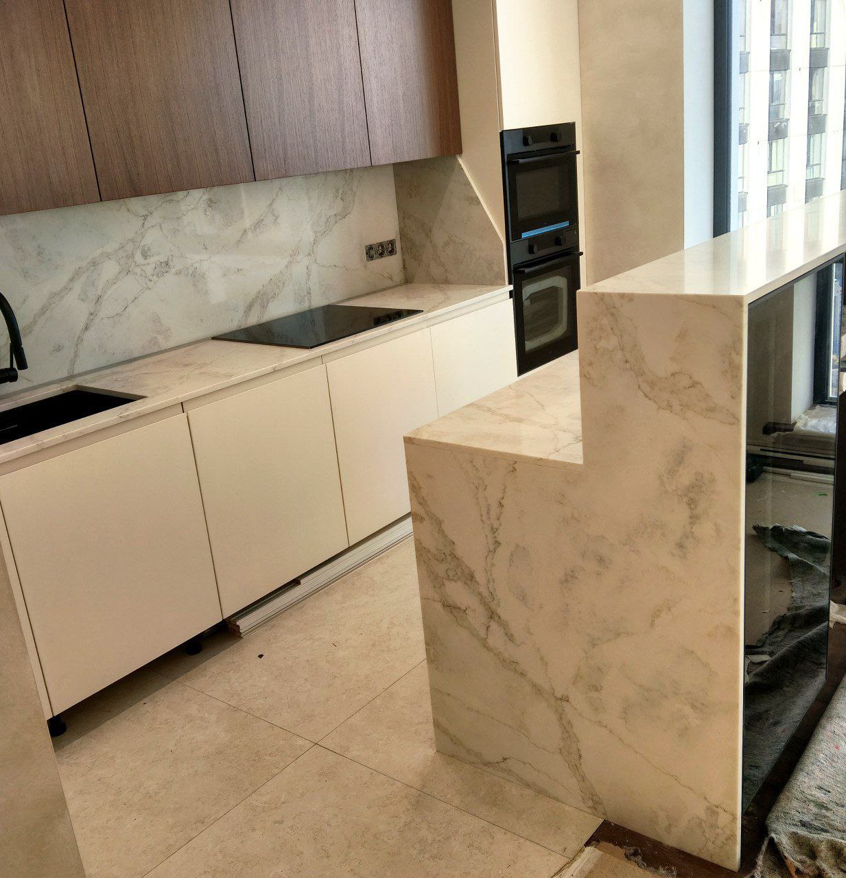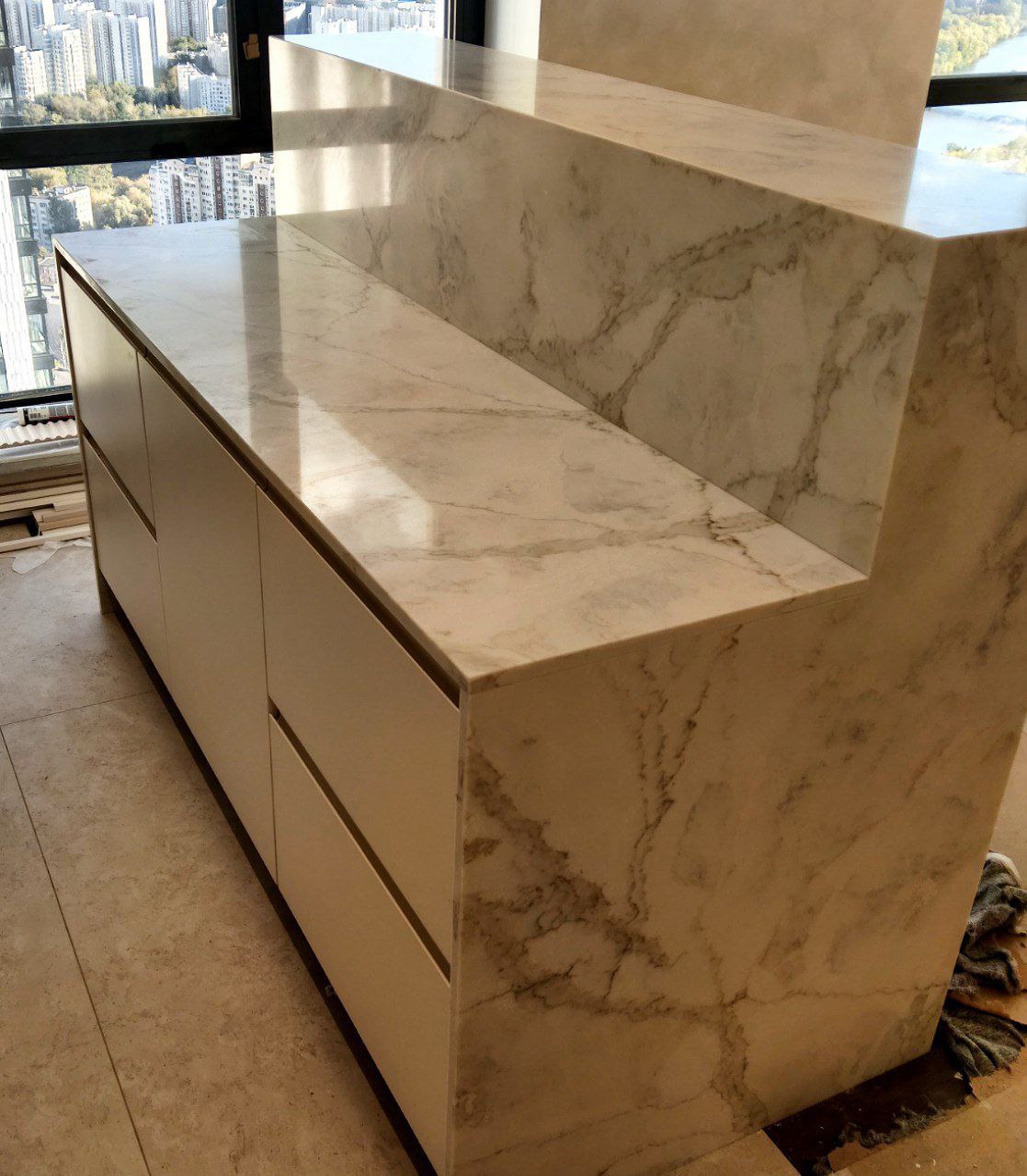 Проект построен на гармоничном сочетании двух независимых, но стилистически связанных элементов. Основная рабочая зона и монолитный остров образуют продуманную планировку, где каждая поверхность выполняет свою роль. Единый серый цвет с контрастными прожилками в стиле Calacatta объединяет композицию, а тонкий профиль столешниц придает всему пространству современный и легкий вид.