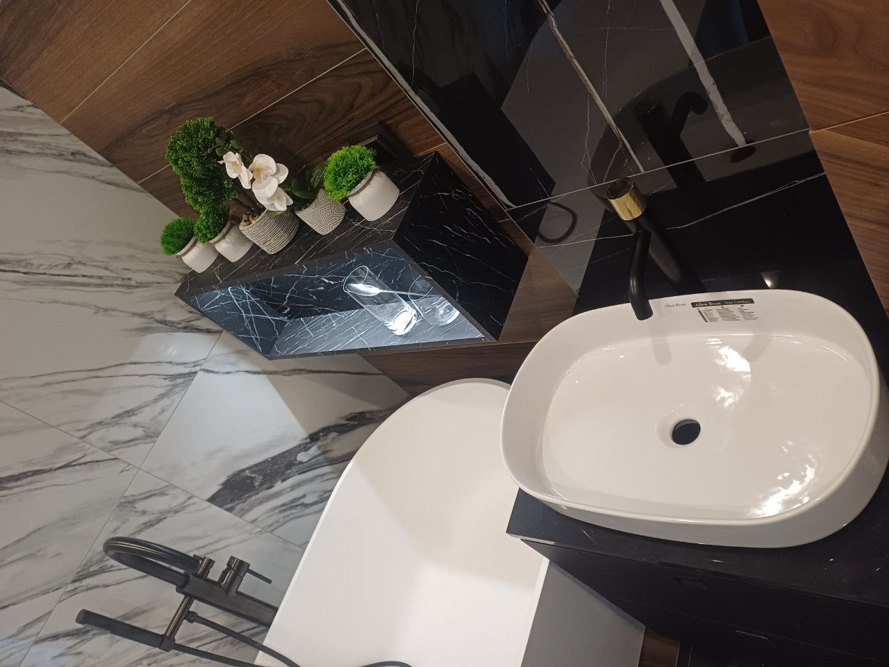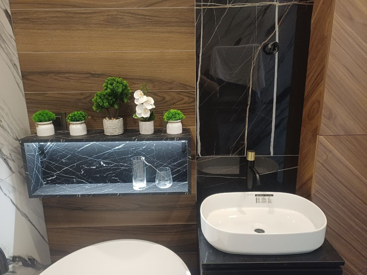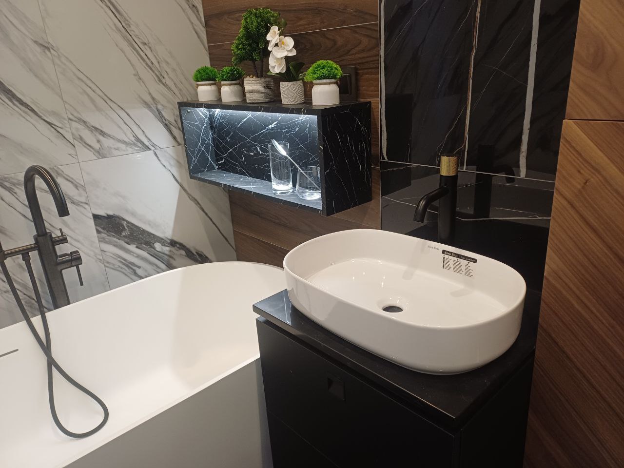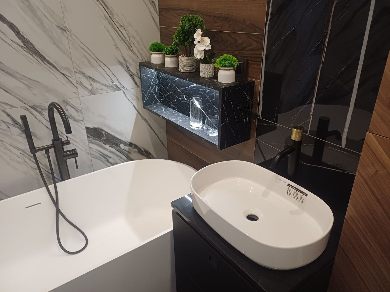 Ванная комната приобрела индивидуальность и яркий характер благодаря продуманному сочетанию материалов. Кварцевый агломерат продемонстрировал свои лучшие качества — от практической долговечности до богатых декоративных возможностей. Полученный интерьер подтверждает, что контрастные решения при профессиональном подходе создают по-настоящему эффектное и гармоничное пространство.