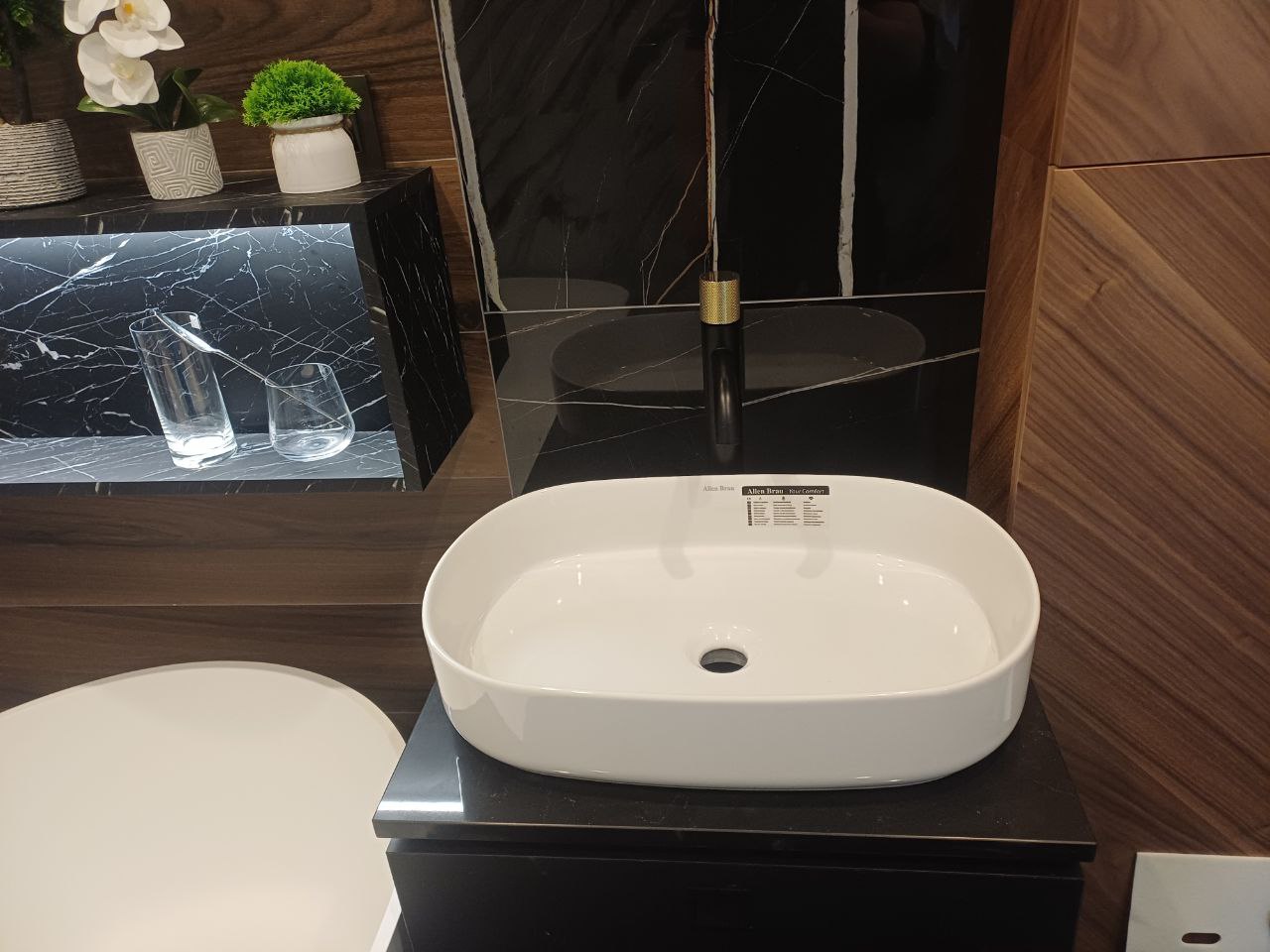 - Темная столешница из кварца служит идеальной основой для массивной белой раковины, усиливая чистоту ее линий.