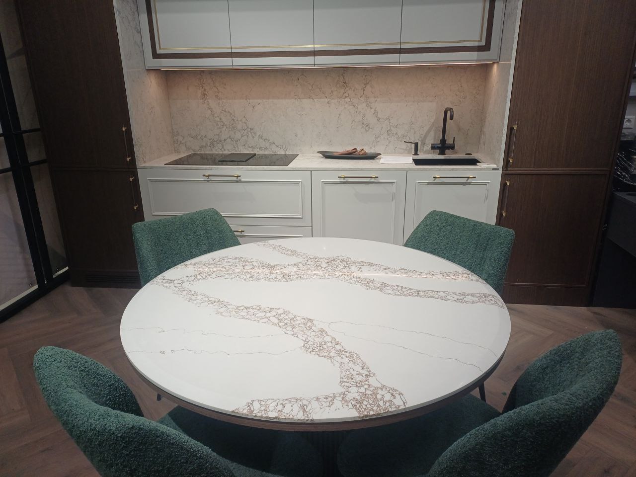 Круглый стол с тонкой кварцевой столешницей стал центральным элементом гостиной, сочетающим изысканную эстетику и функциональность.