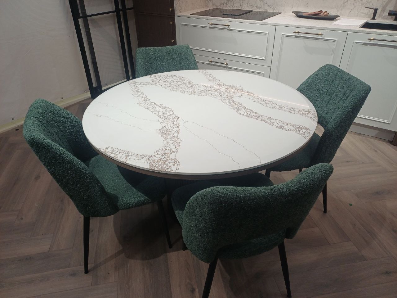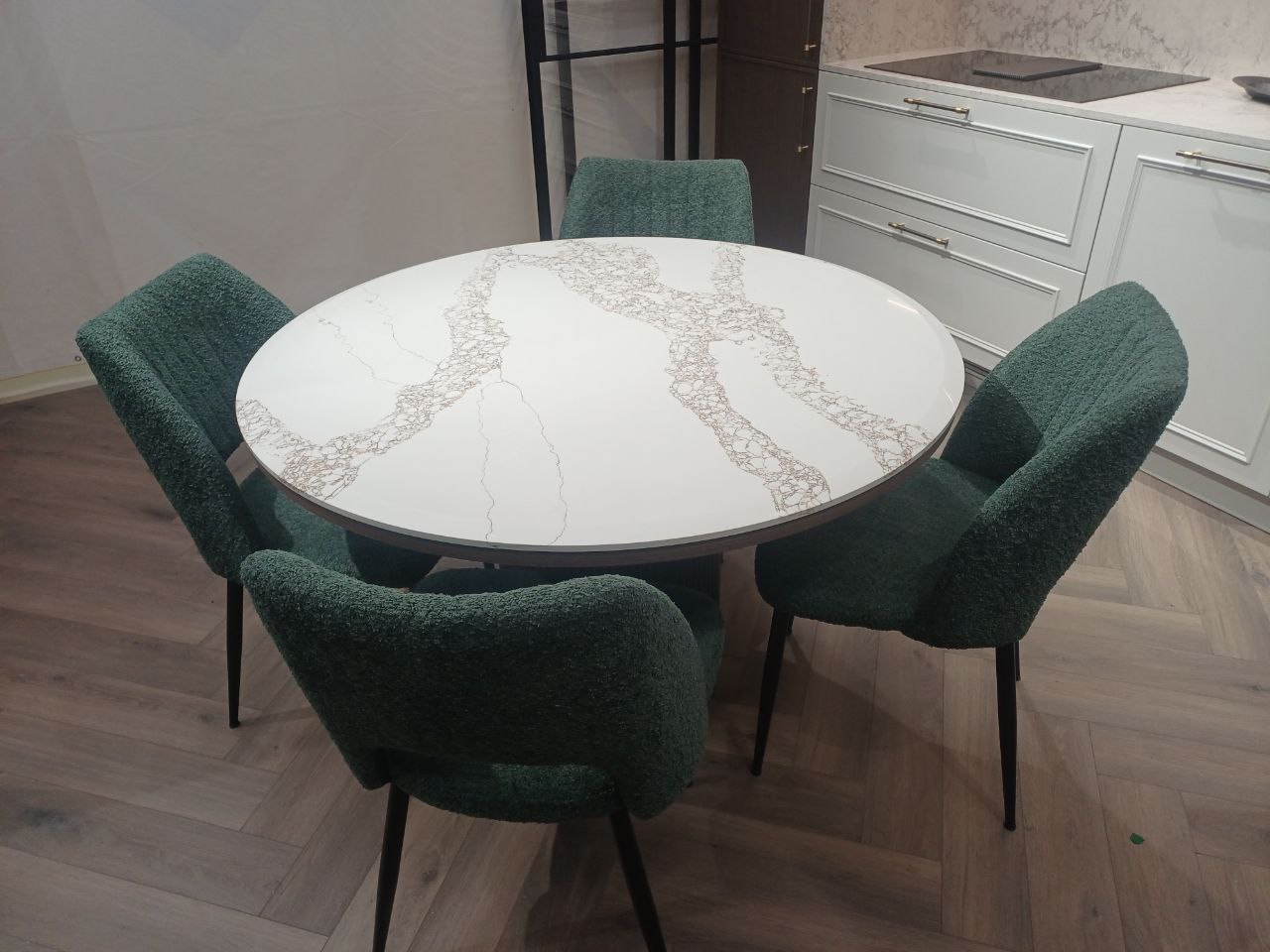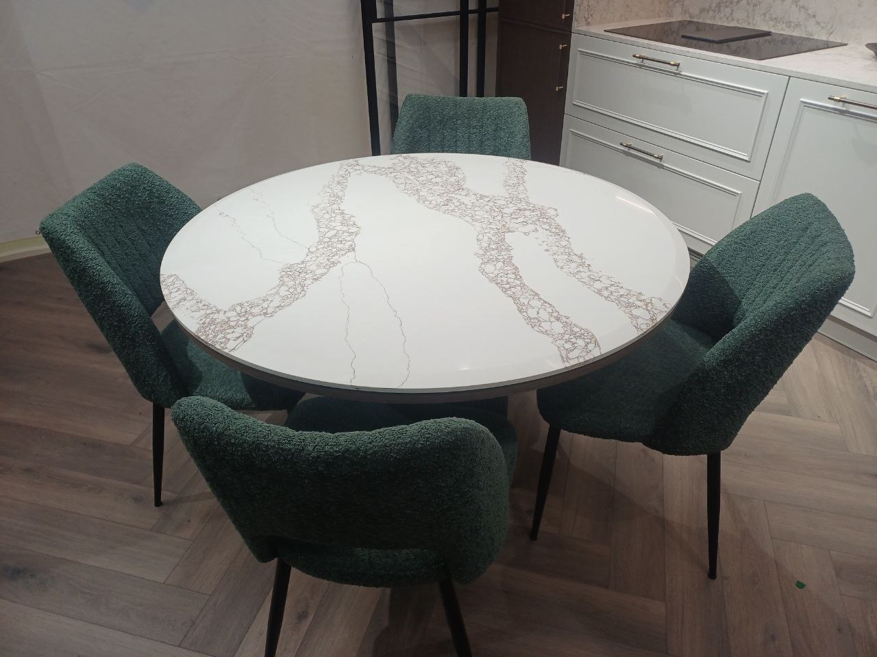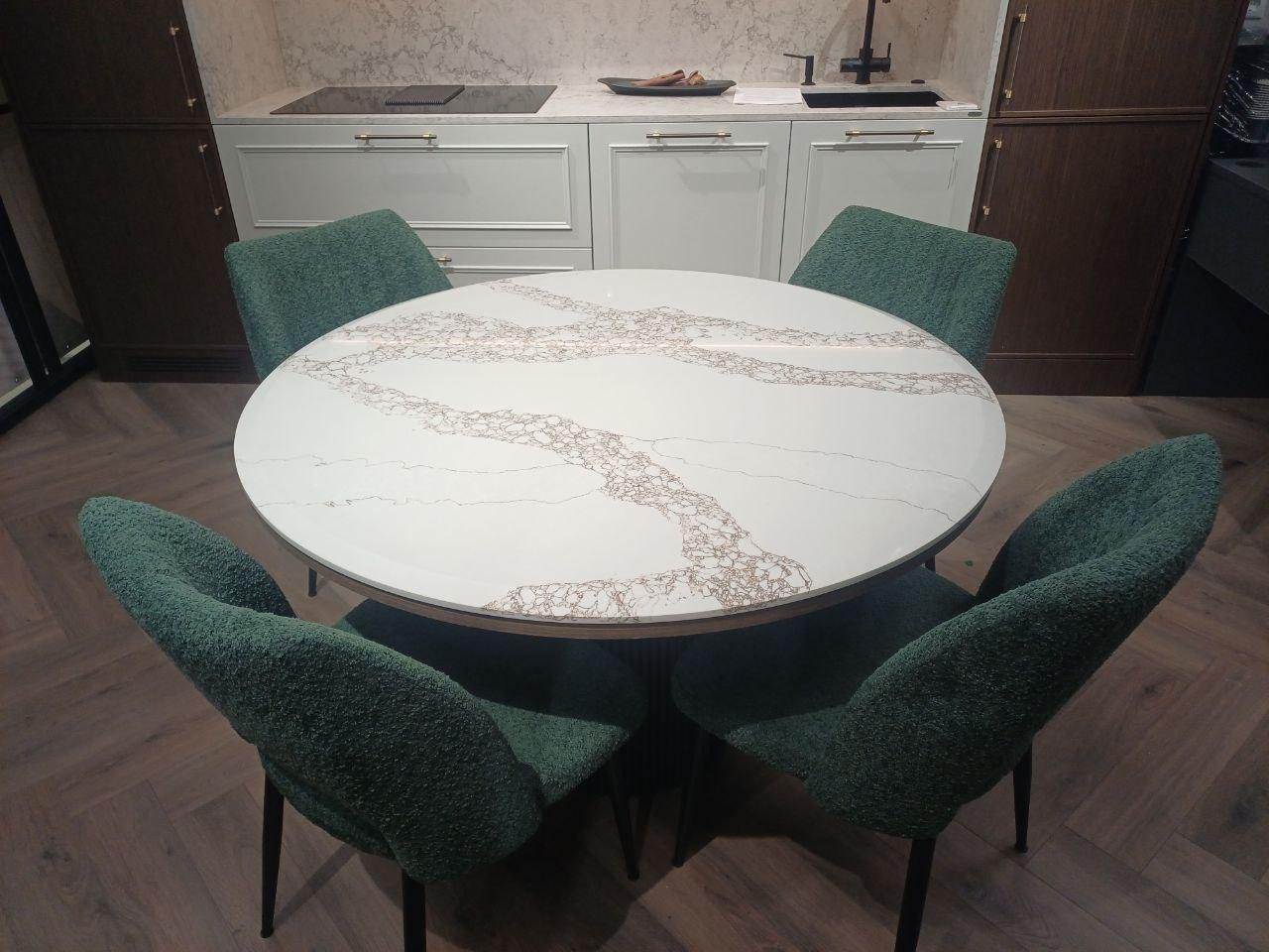 Элегантный круглый стол с кварцевой столешницей в стиле Calacatta