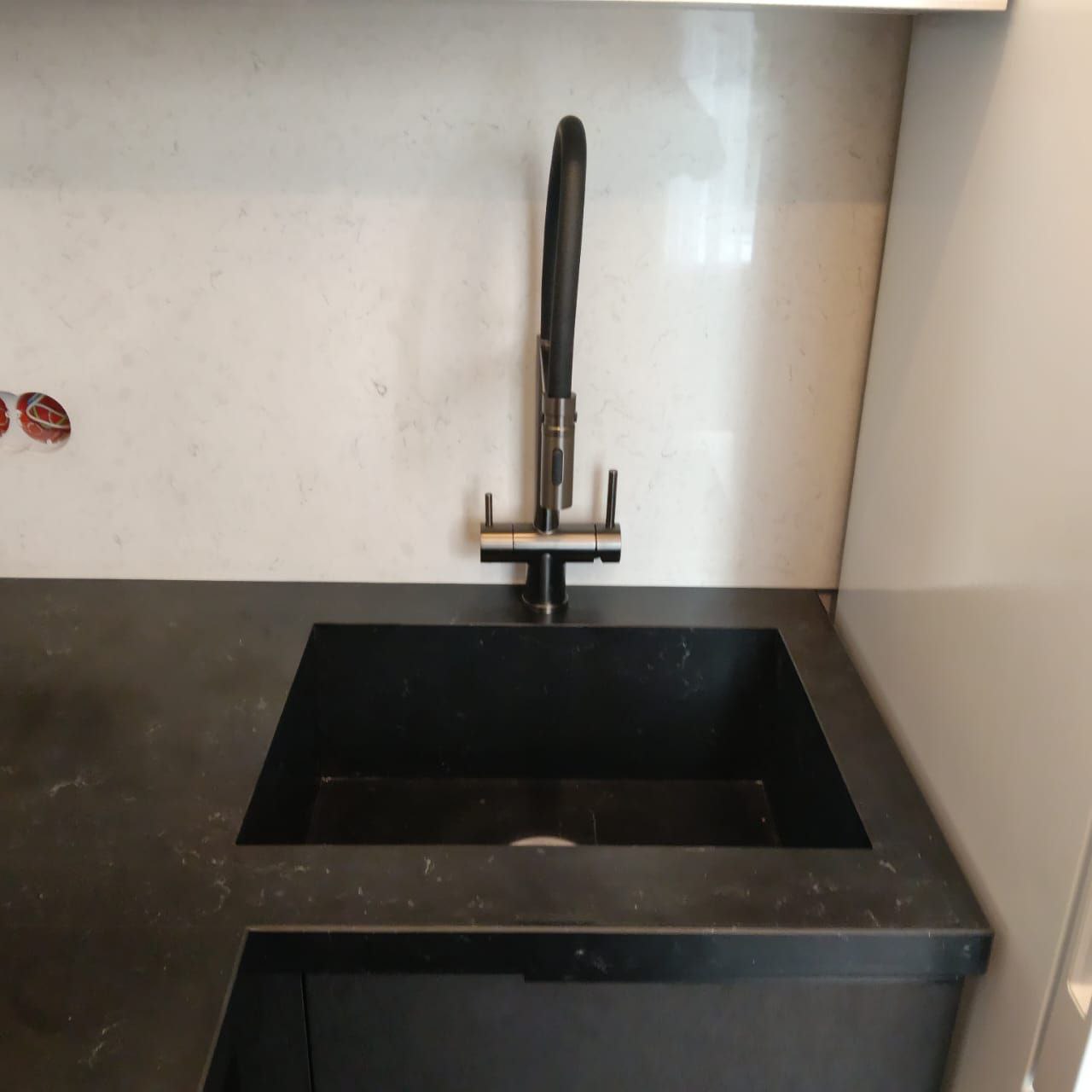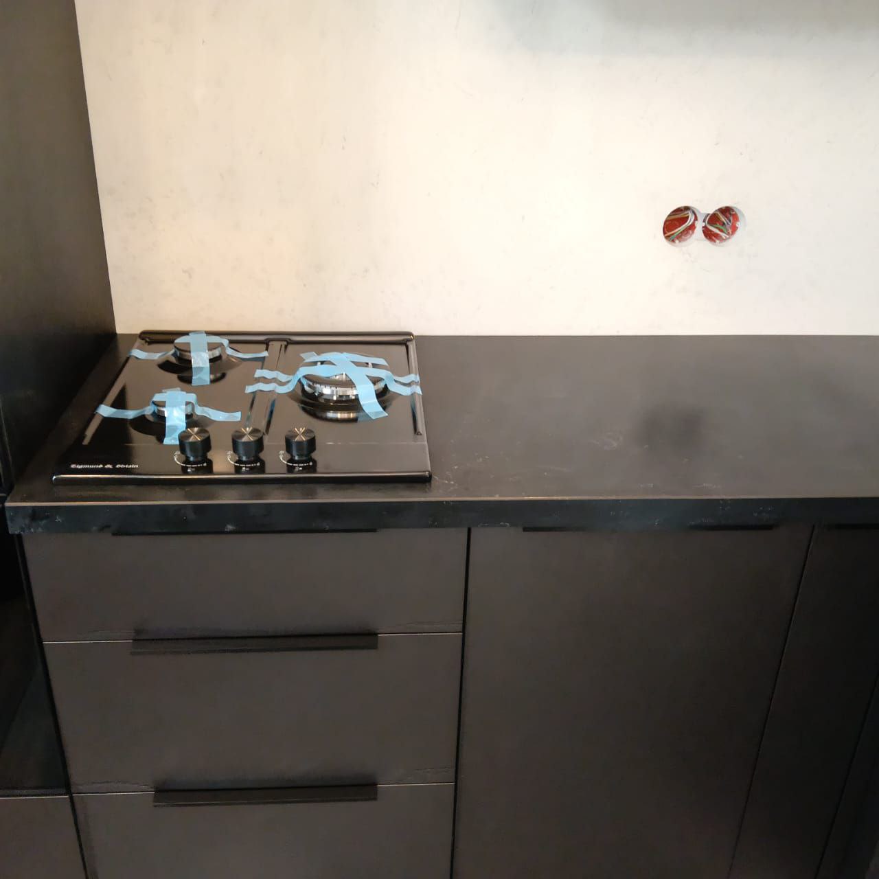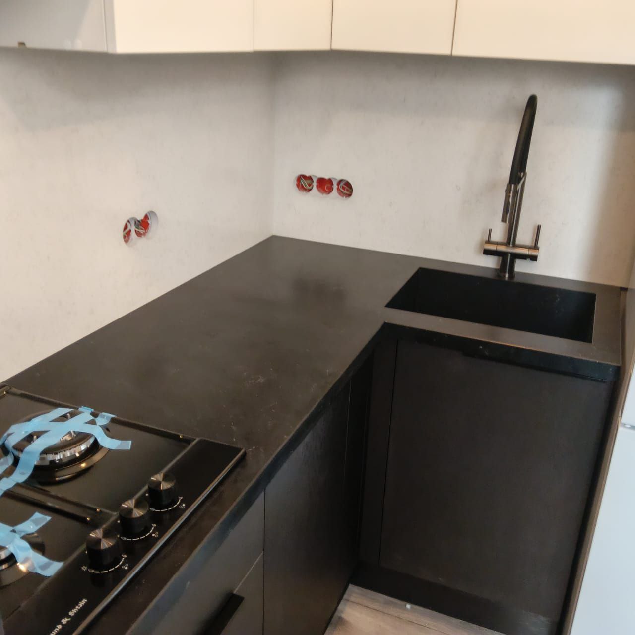 Черная матовая кварцевая столешница стала ключевым элементом кухни, подчеркивая современный стиль и практичность.