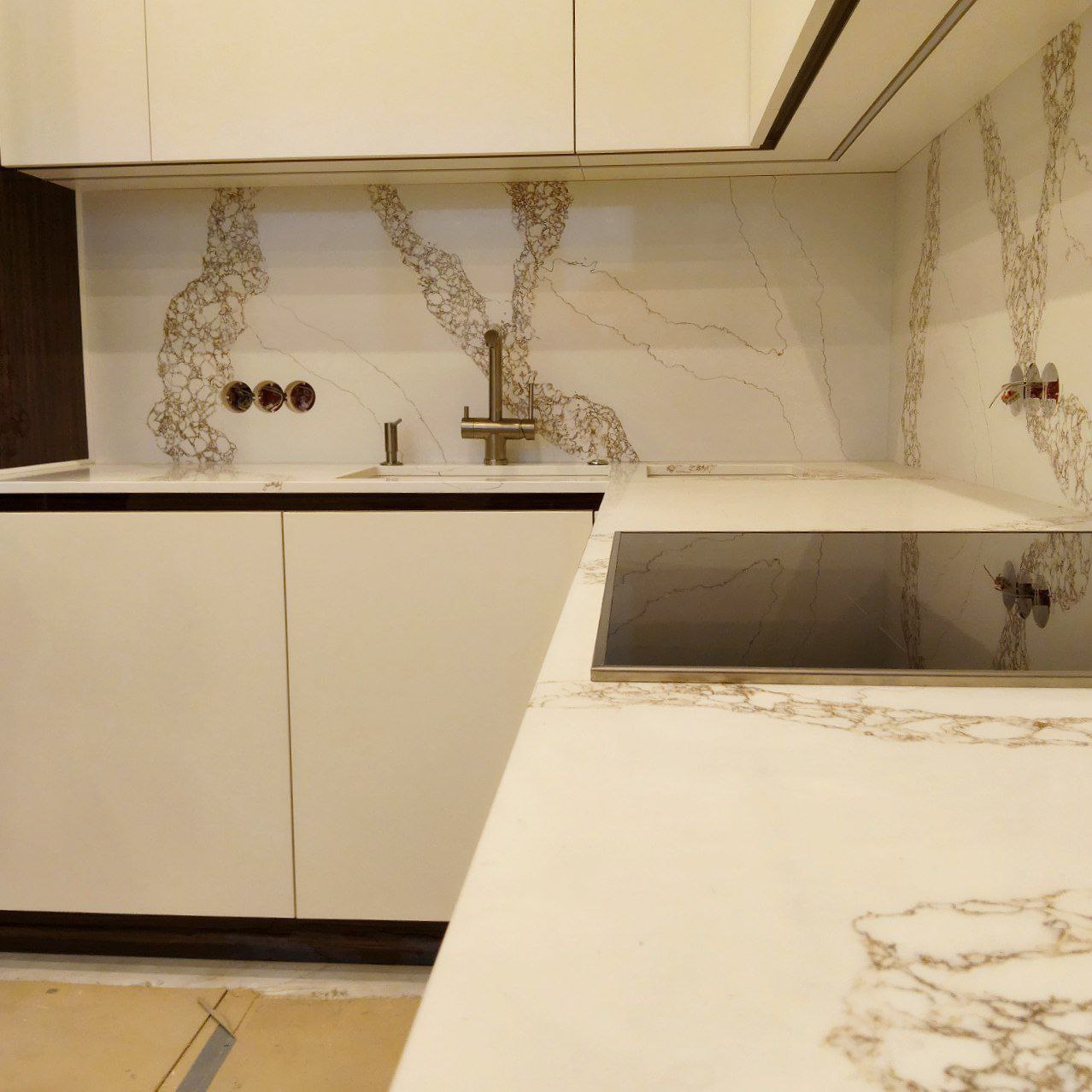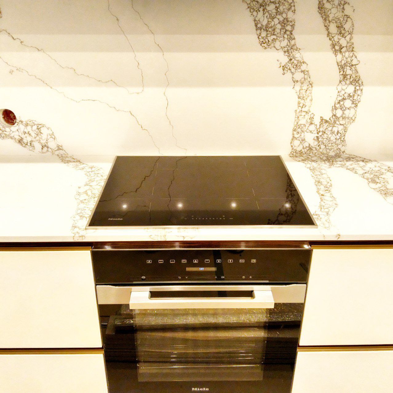 Проект демонстрирует премиальный подход к созданию кухонного пространства. Использование кварцевой столешницы с уникальным рисунком Calacatta золотого оттенка позволило создать не просто функциональный гарнитур, а произведение искусства. Каждая деталь – от расположения прожилок на столешнице до подбора фурнитуры – работает на создание образа роскоши и безупречного вкуса.