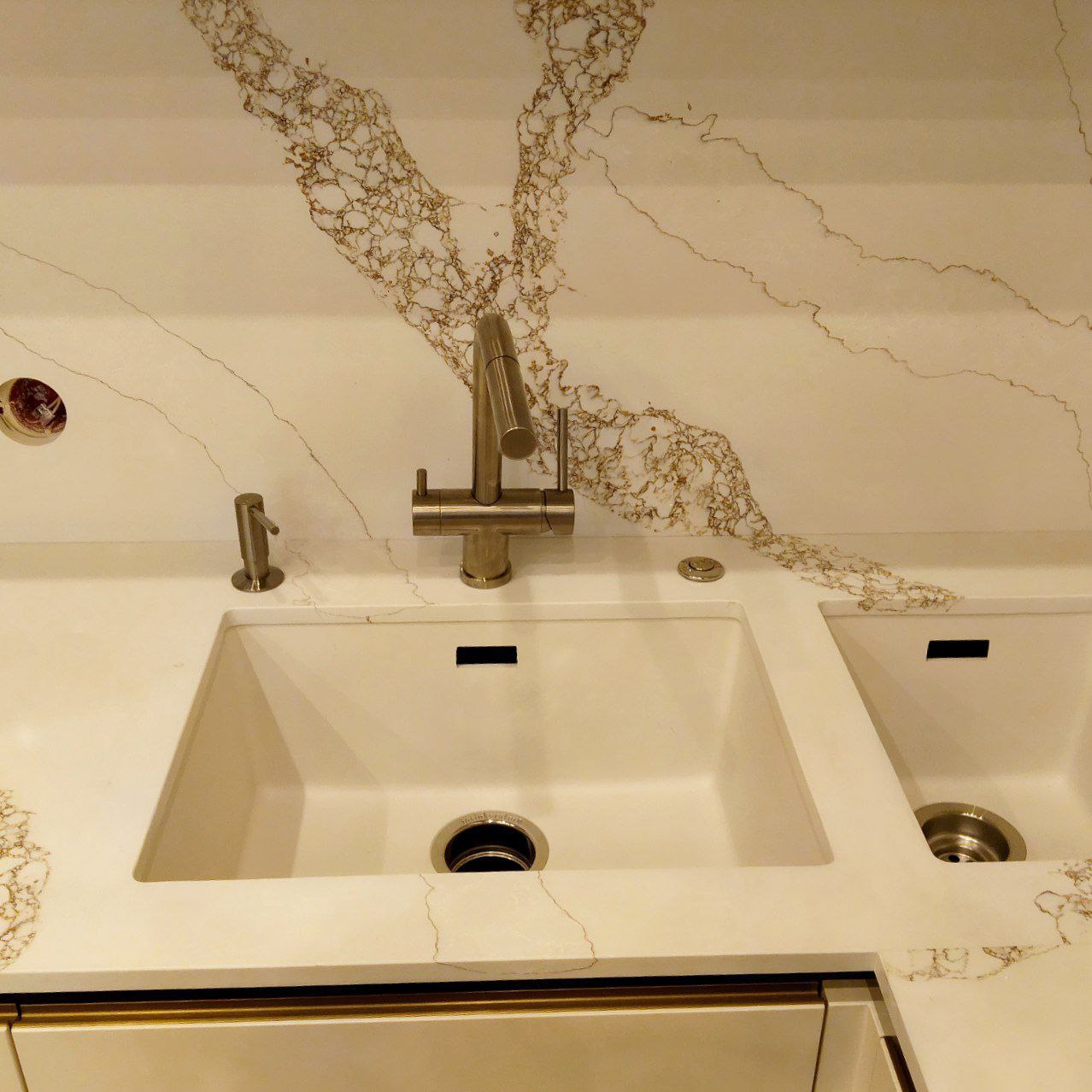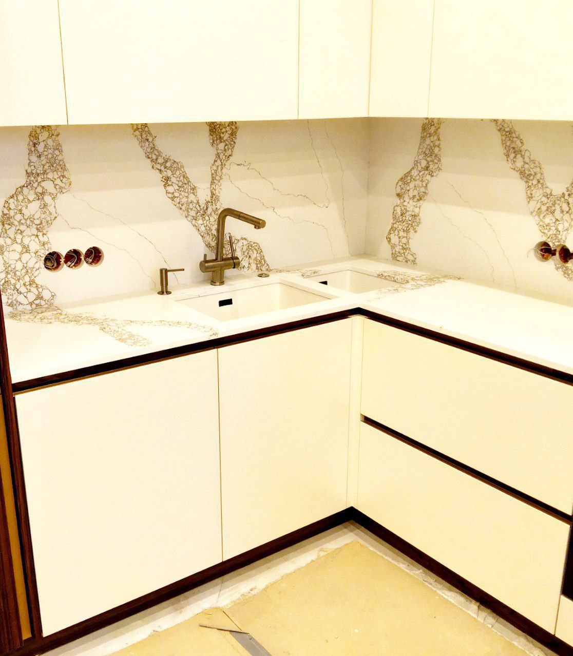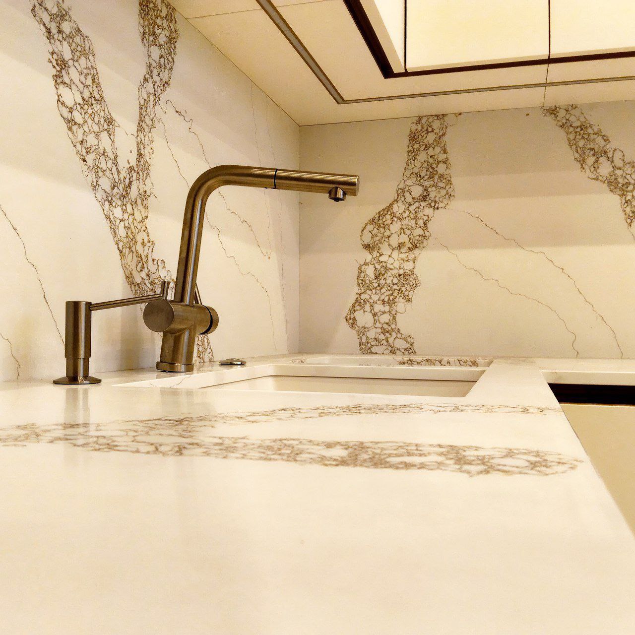 - Золотой кран над интегрированной мойкой повторяет цветовую палитру прожилок в кварце.
