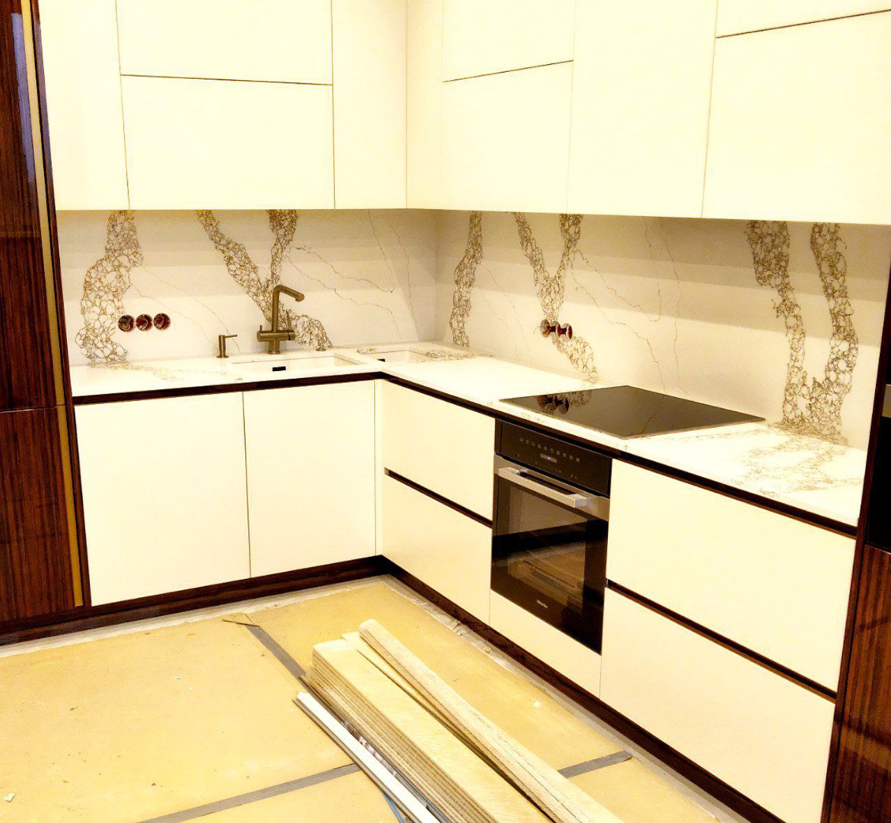 Роскошь в деталях: Г-образная кухня в стиле Calacatta с золотыми акцентами
