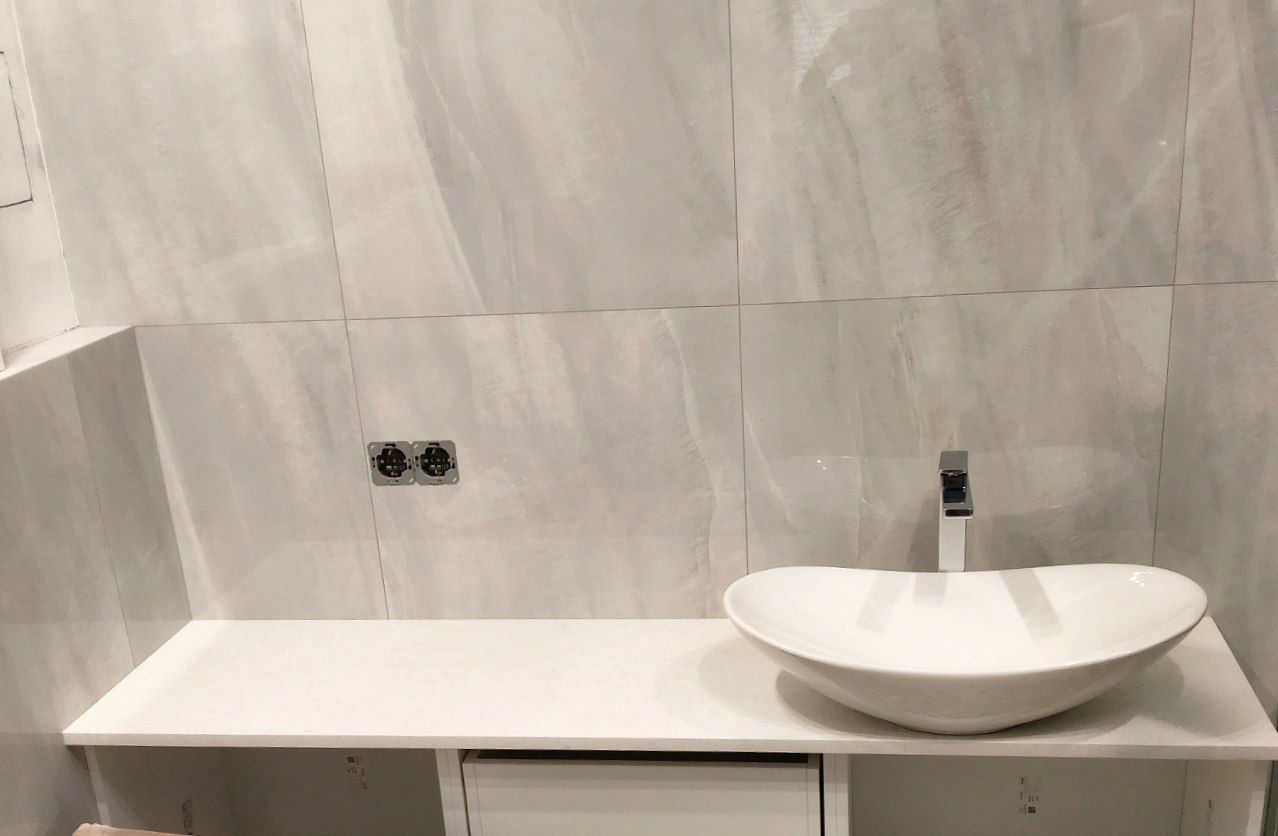 Ванная комната обрела завершенный вид благодаря сочетанию функциональности и лаконичного дизайна. Белая матовая кварцевая столешница продемонстрировала, как даже скромные по размерам элементы могут поддерживать общую стилистику светлого и уютного пространства.