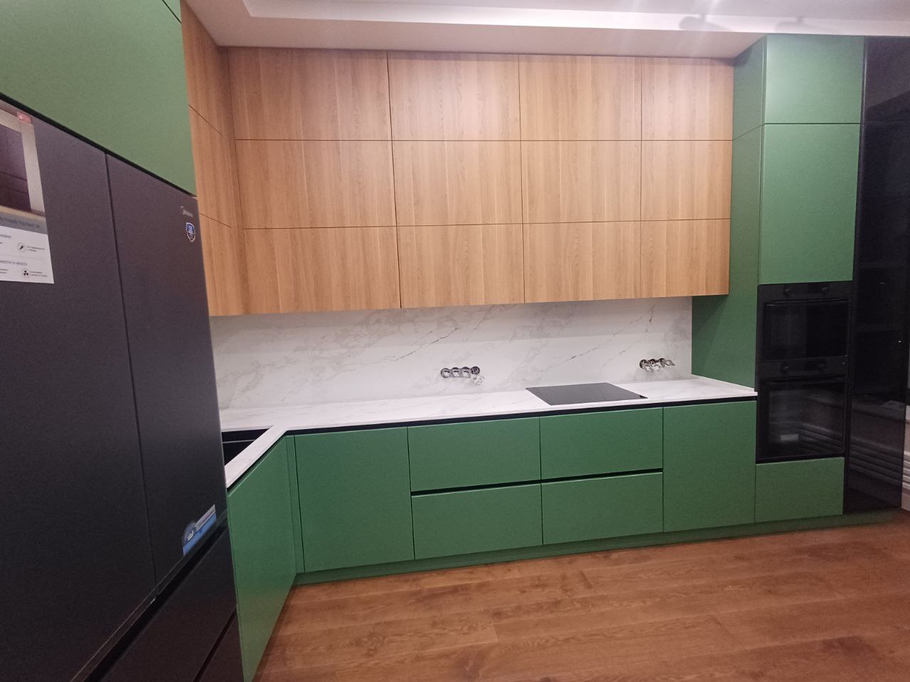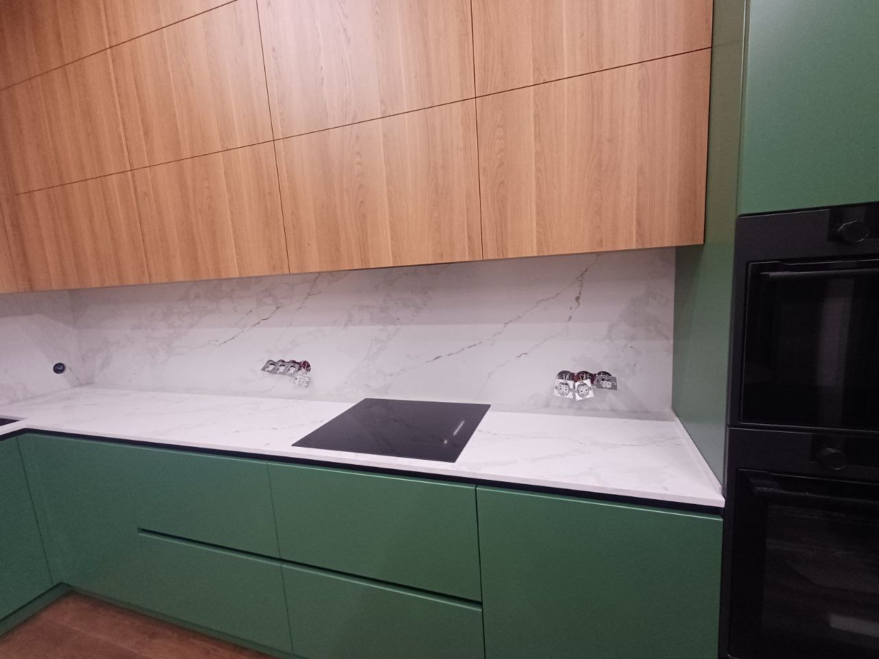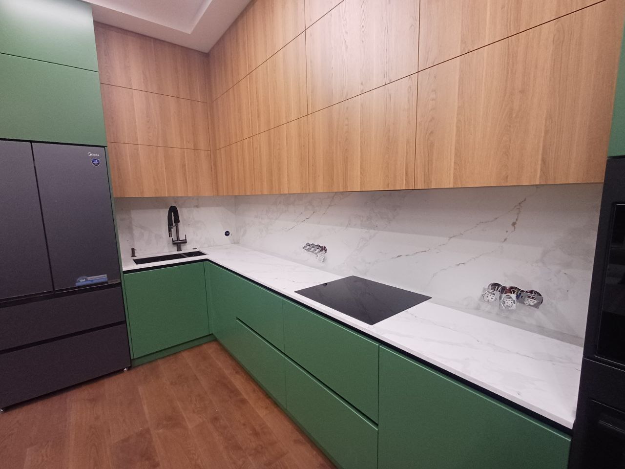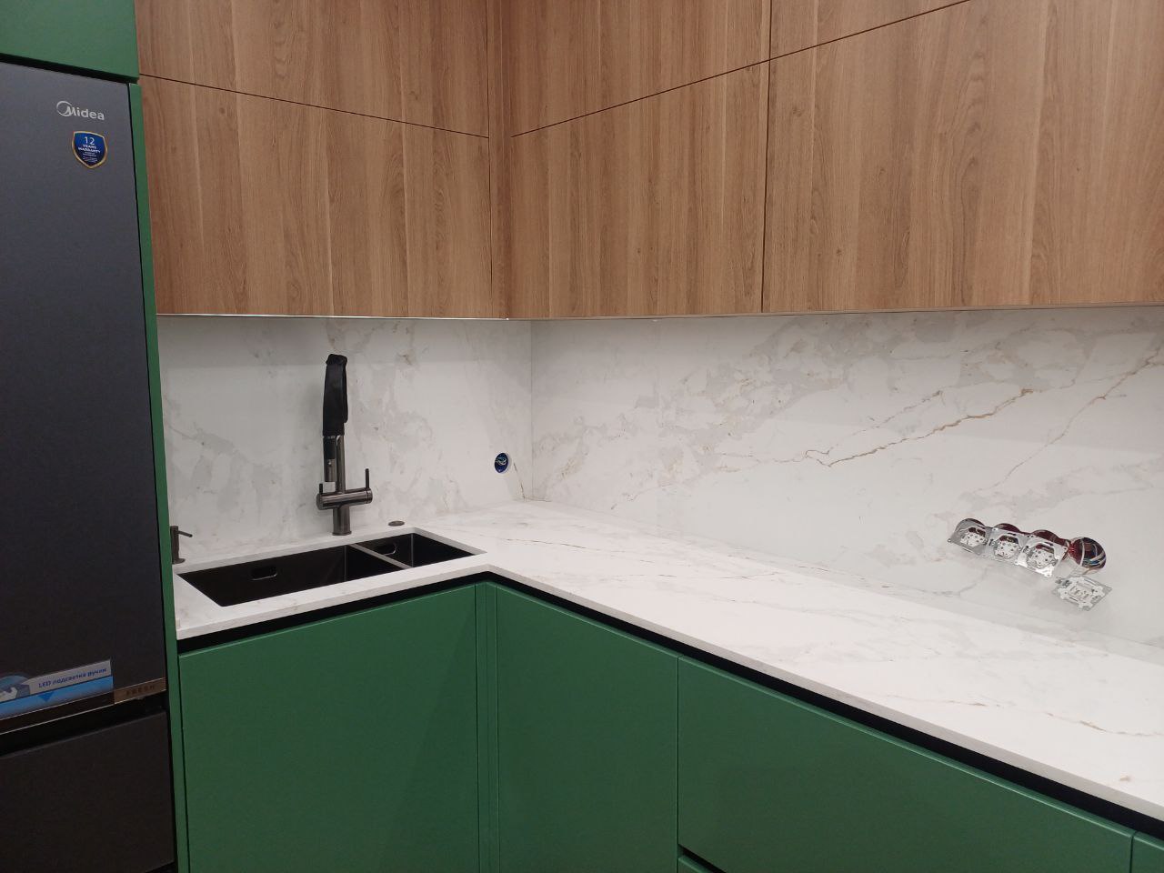 Интерьер построен на смелом сочетании трех ключевых элементов: белой кварцевой столешницы с графичными прожилками, теплых фасадов под дерево и насыщенных зеленых шкафов. Г-образная столешница с контрастным рисунком становится связующим звеном между разными цветовыми зонами, объединяя их в гармоничную композицию.