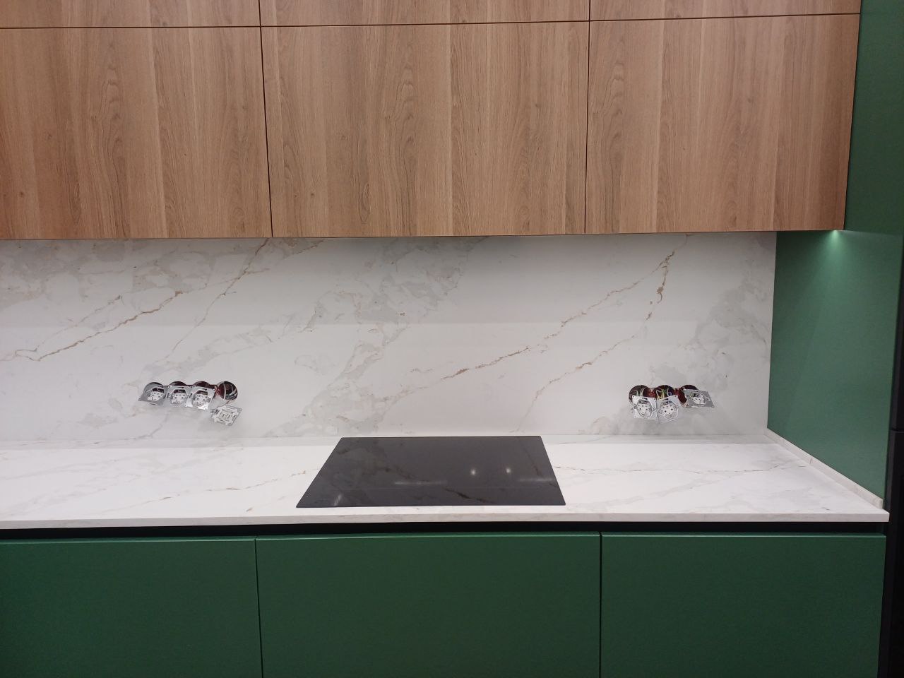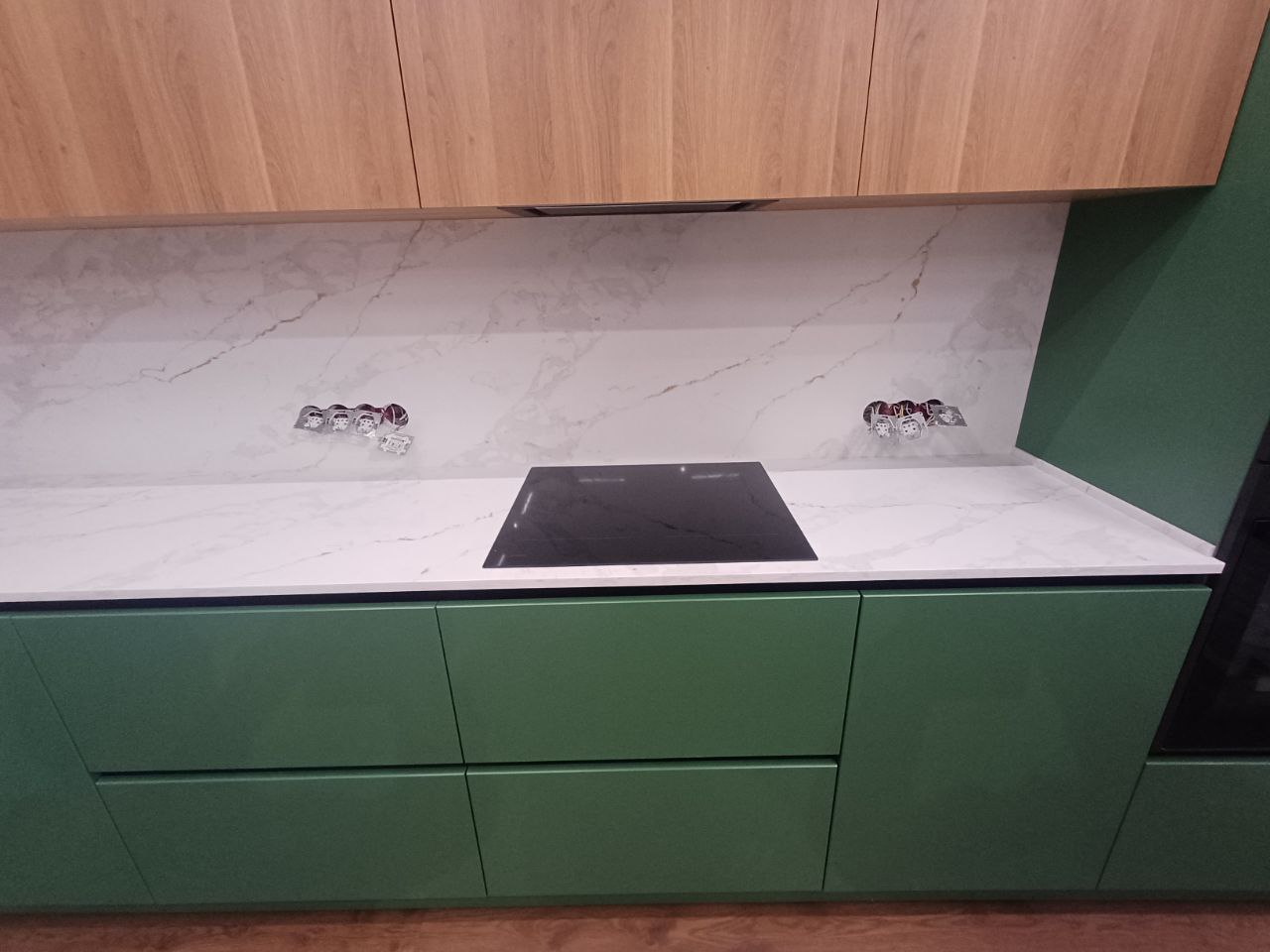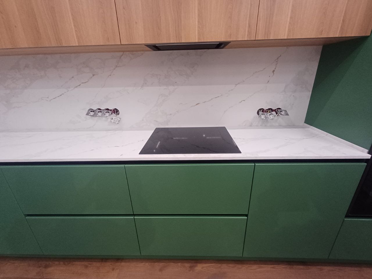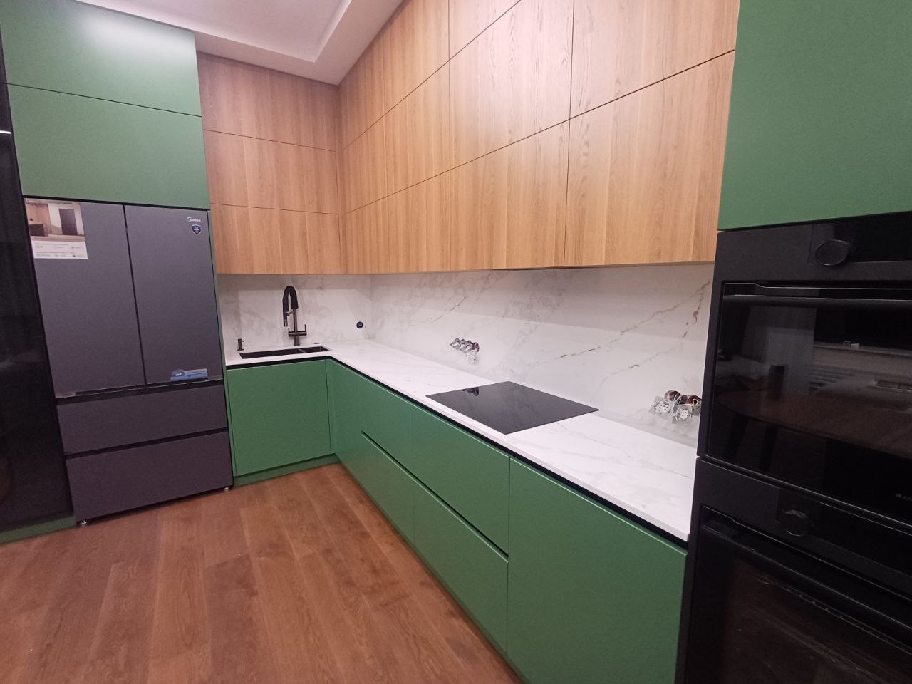 Интерьер построен на смелом сочетании трех ключевых элементов: белой кварцевой столешницы с графичными прожилками, теплых фасадов под дерево и насыщенных зеленых шкафов. Г-образная столешница с контрастным рисунком становится связующим звеном между разными цветовыми зонами, объединяя их в гармоничную композицию.
