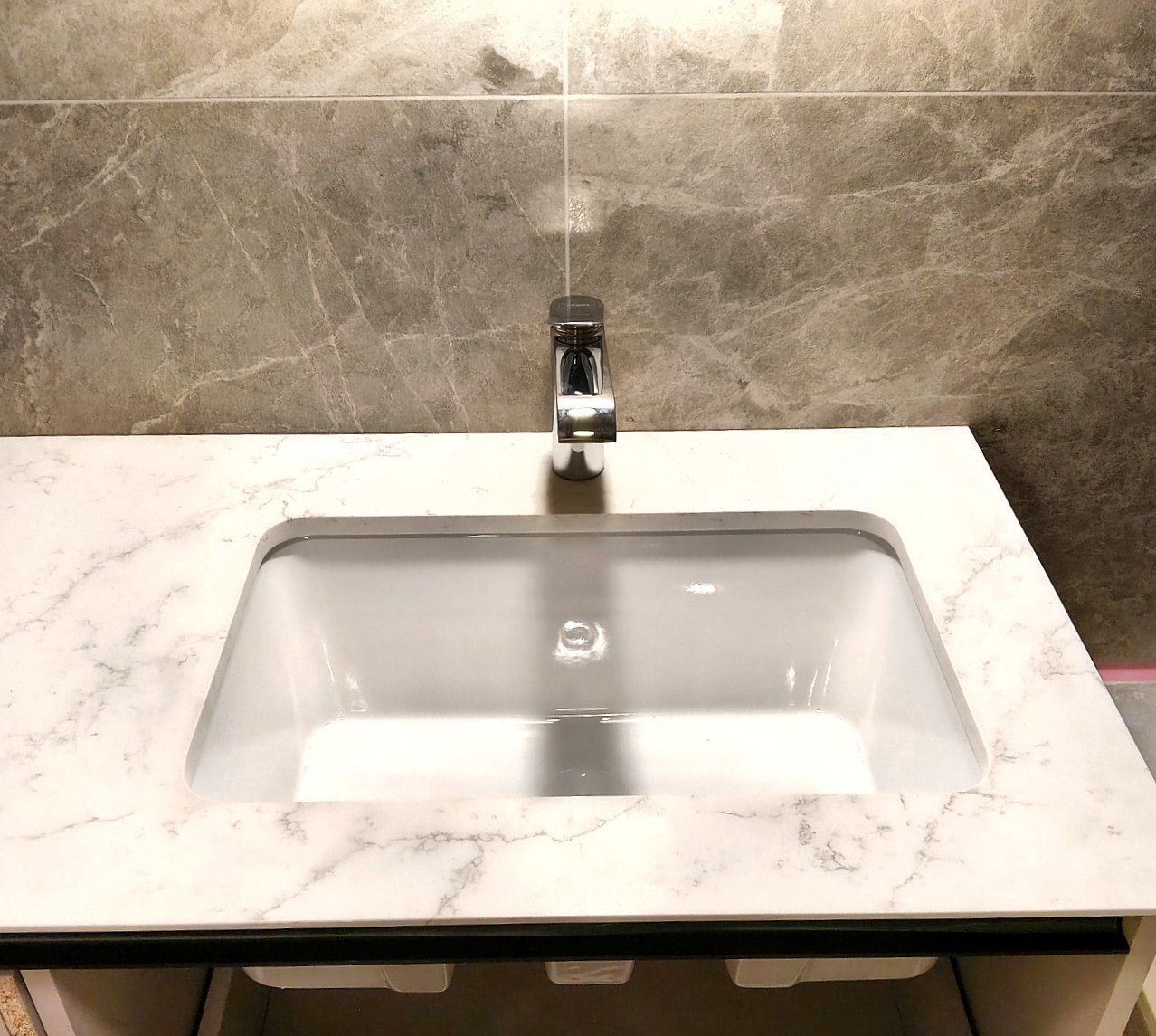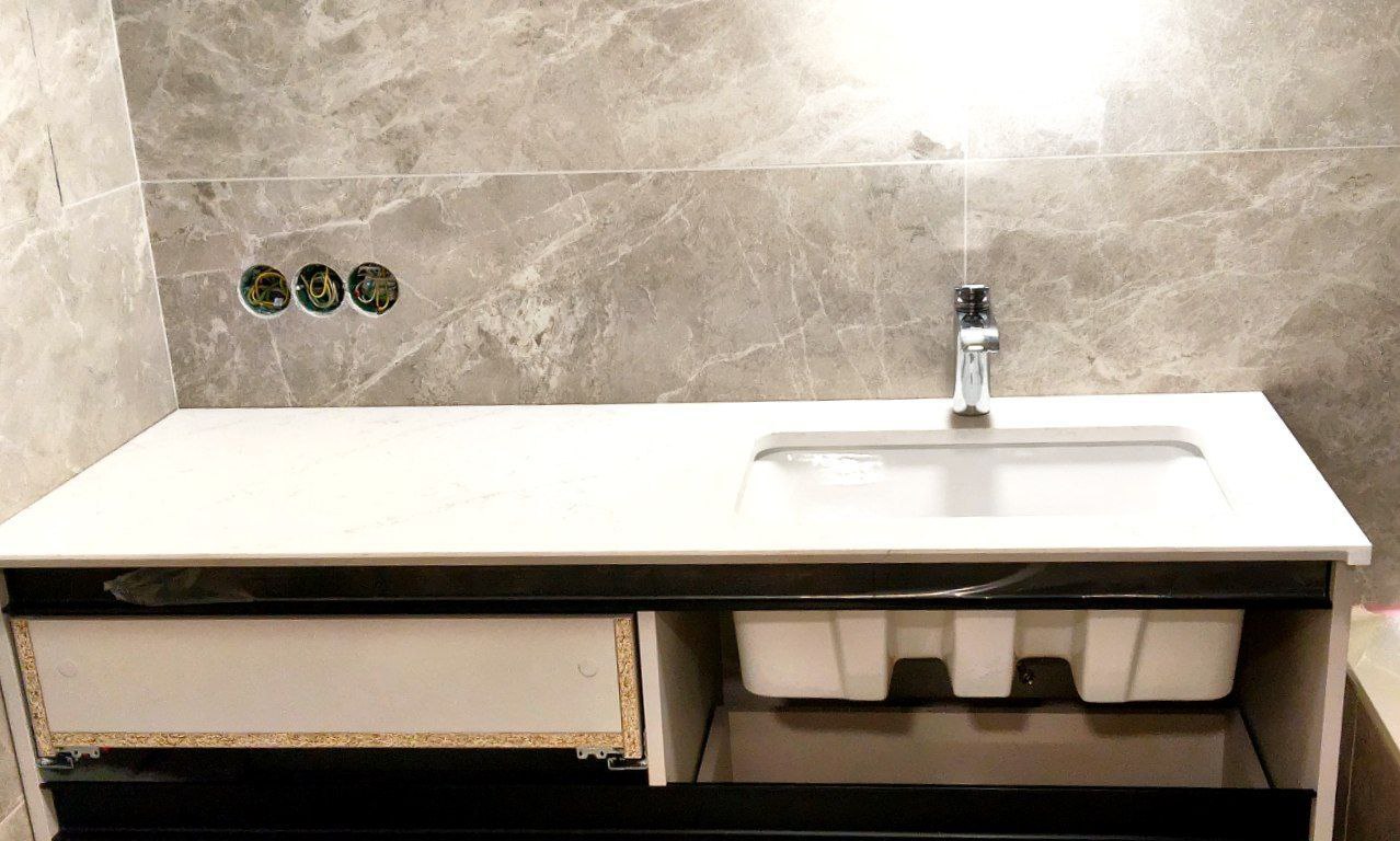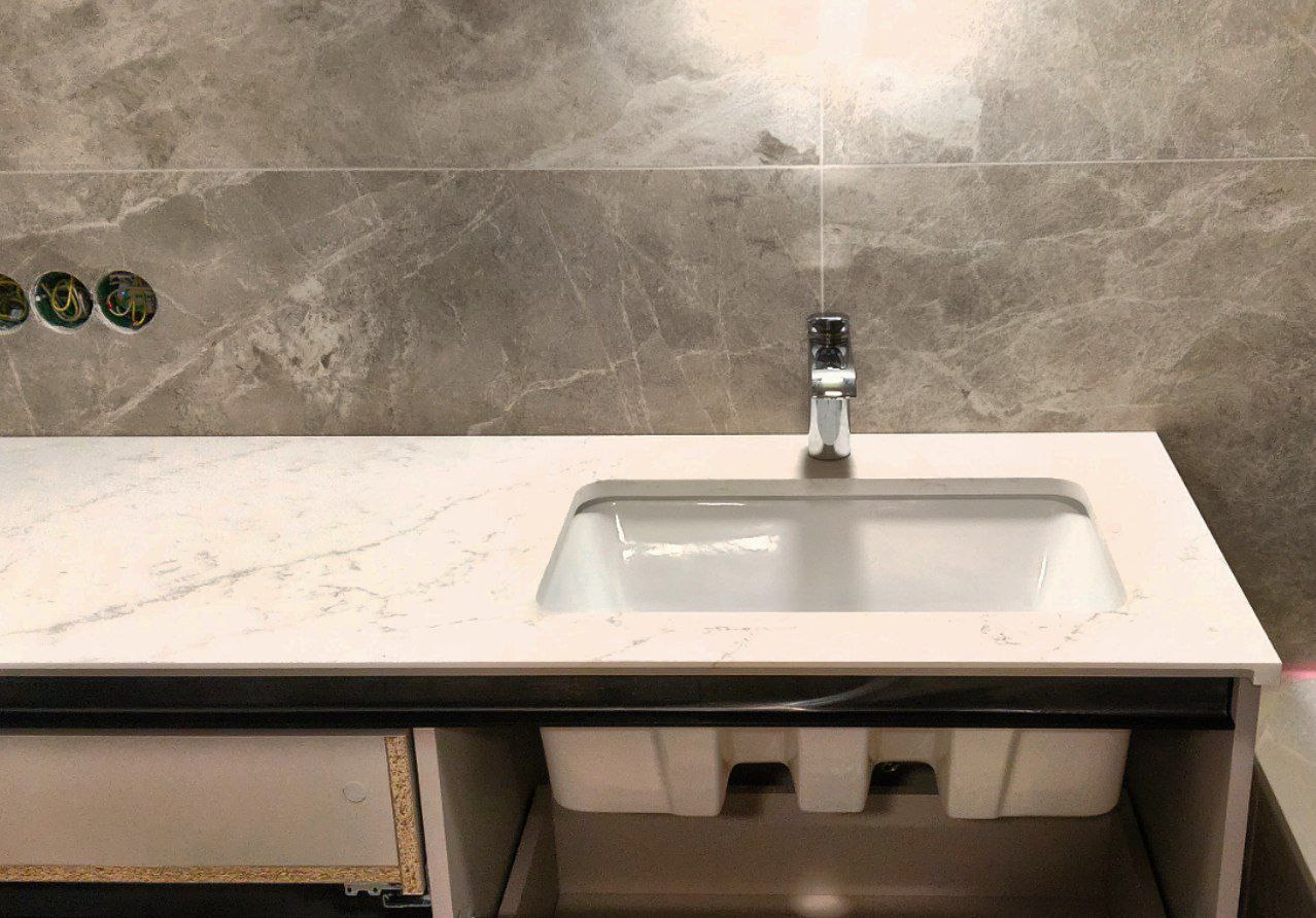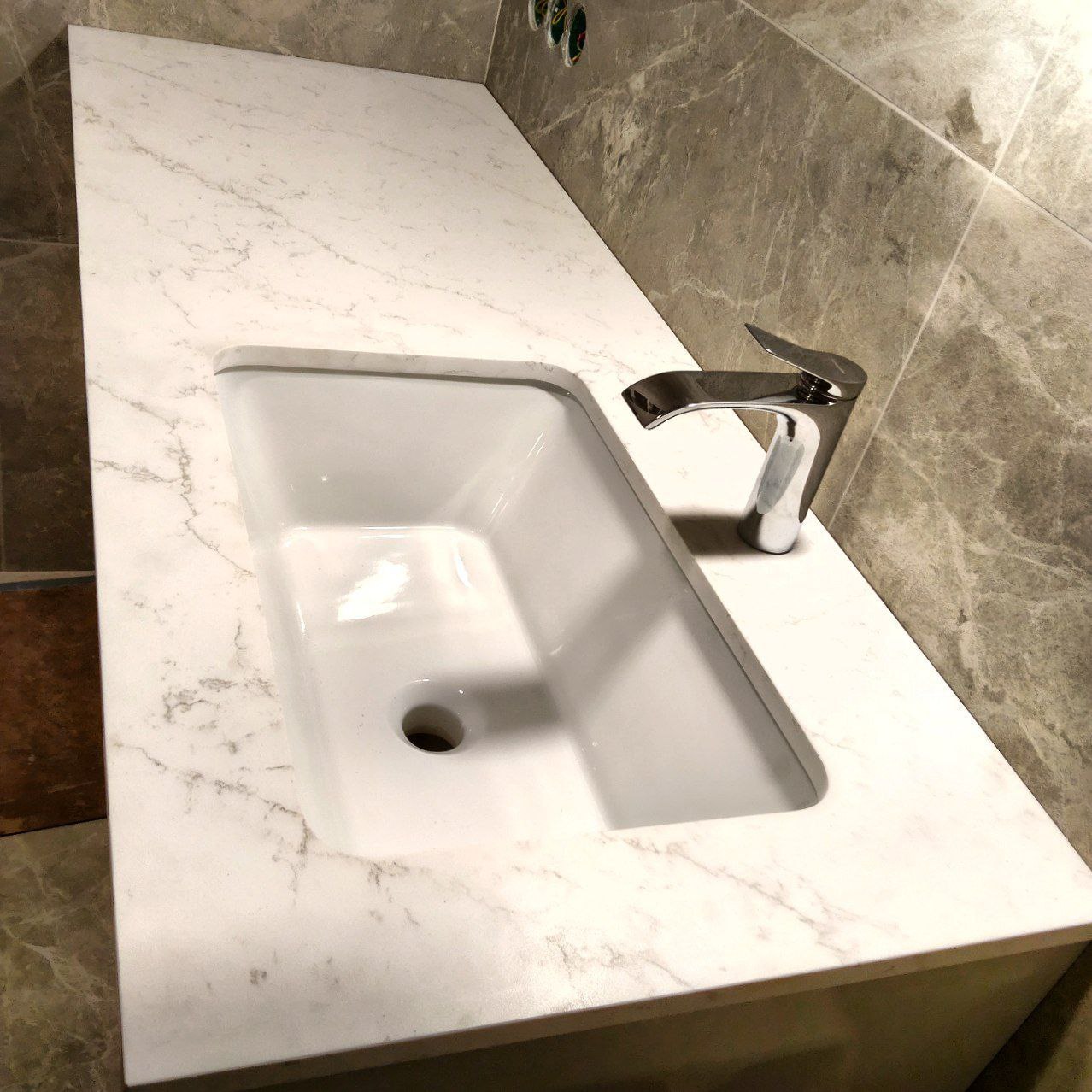 Проект предусматривал создание компактной рабочей поверхности, оптимально использующей ограниченное пространство ванной комнаты. Тонкий профиль и однотонное белое исполнение кварцевой столешницы визуально облегчают конструкцию, делая помещение более просторным.