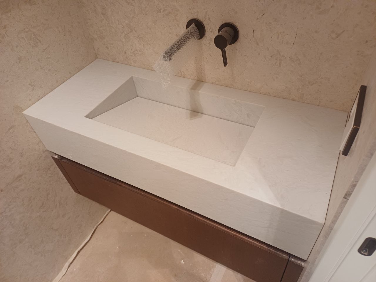 Габаритная кварцевая столешница-мойка стала скульптурным объектом в интерьере ванной, сочетая массивность форм с функциональностью.