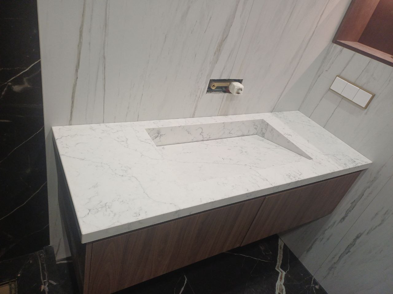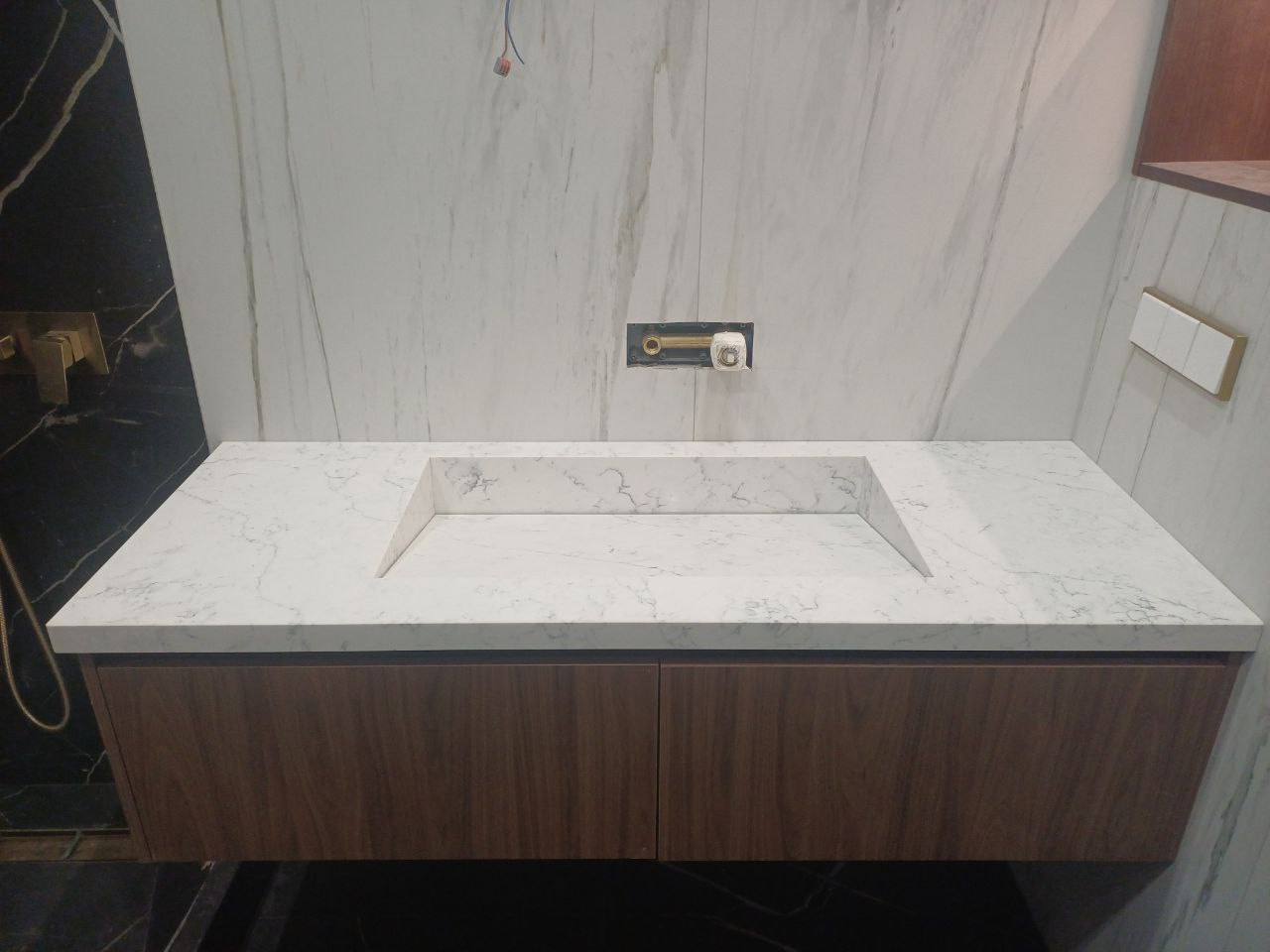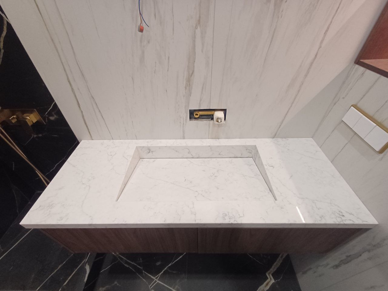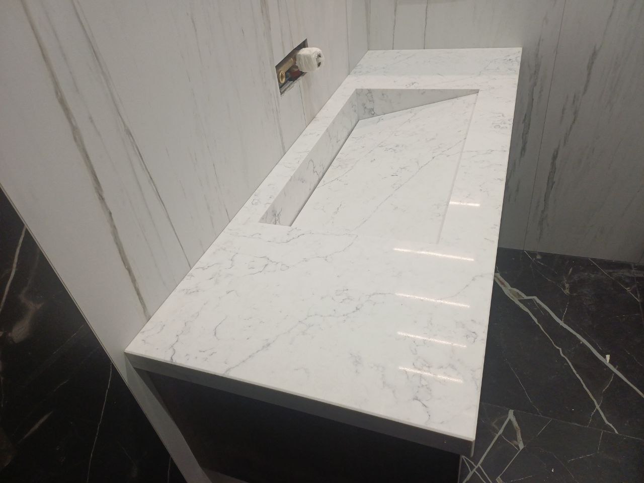 Кварцевая столешница с мойкой демонстрирует практические достоинства материала: