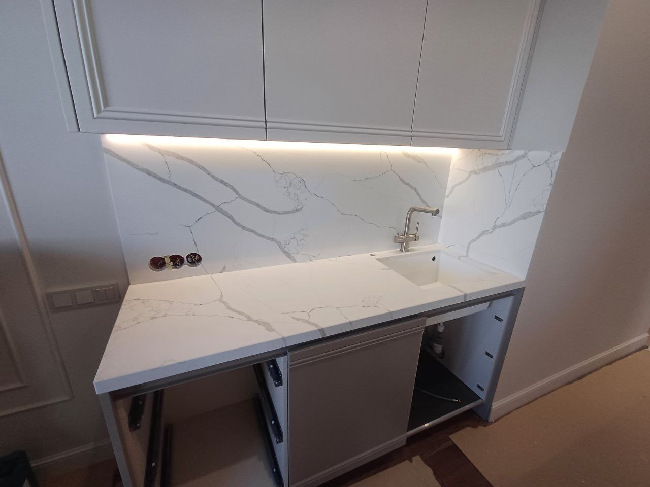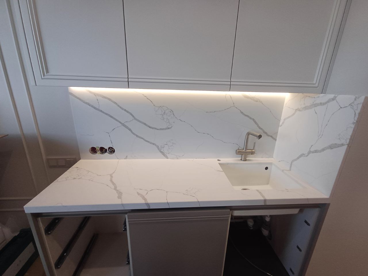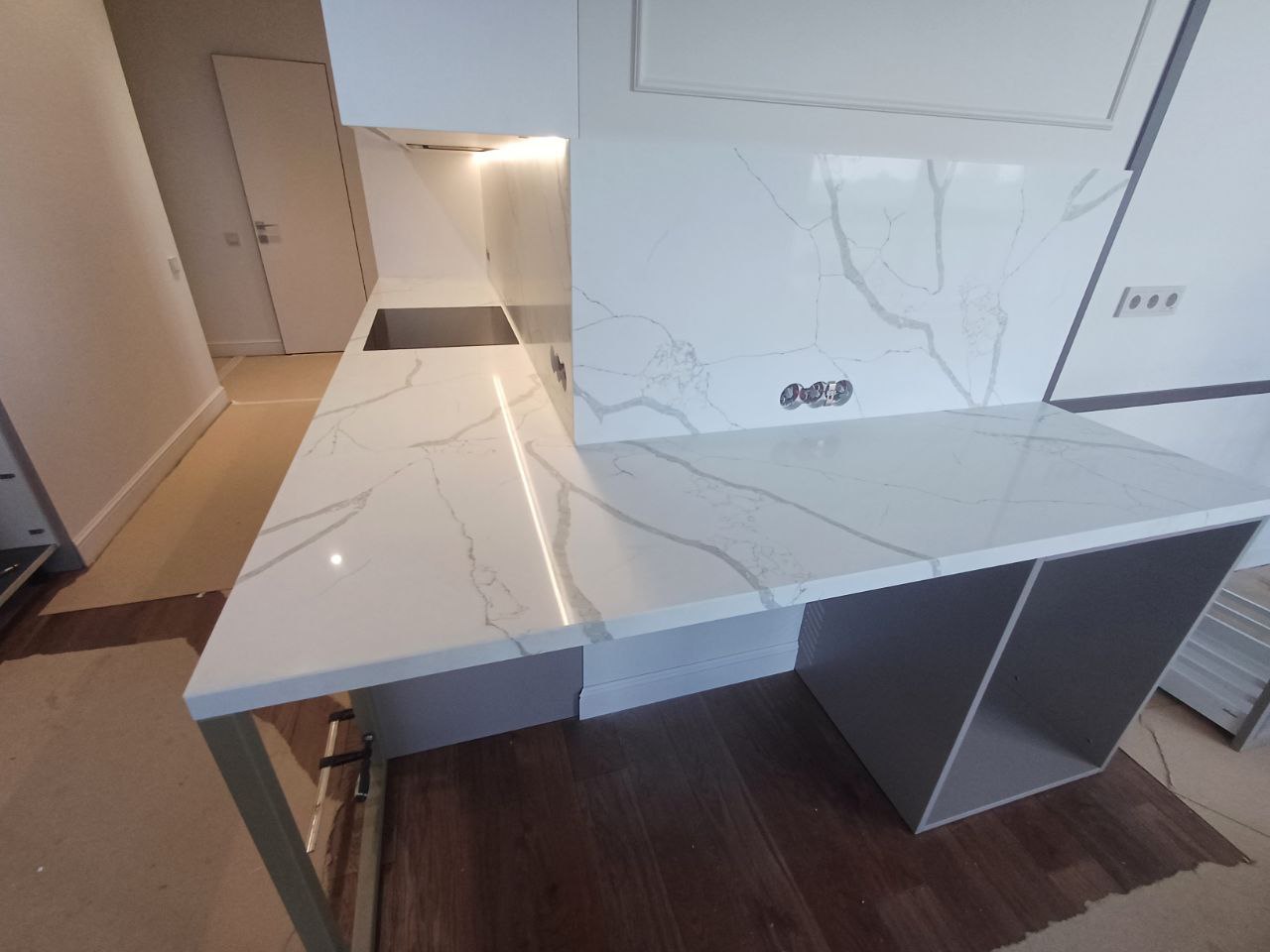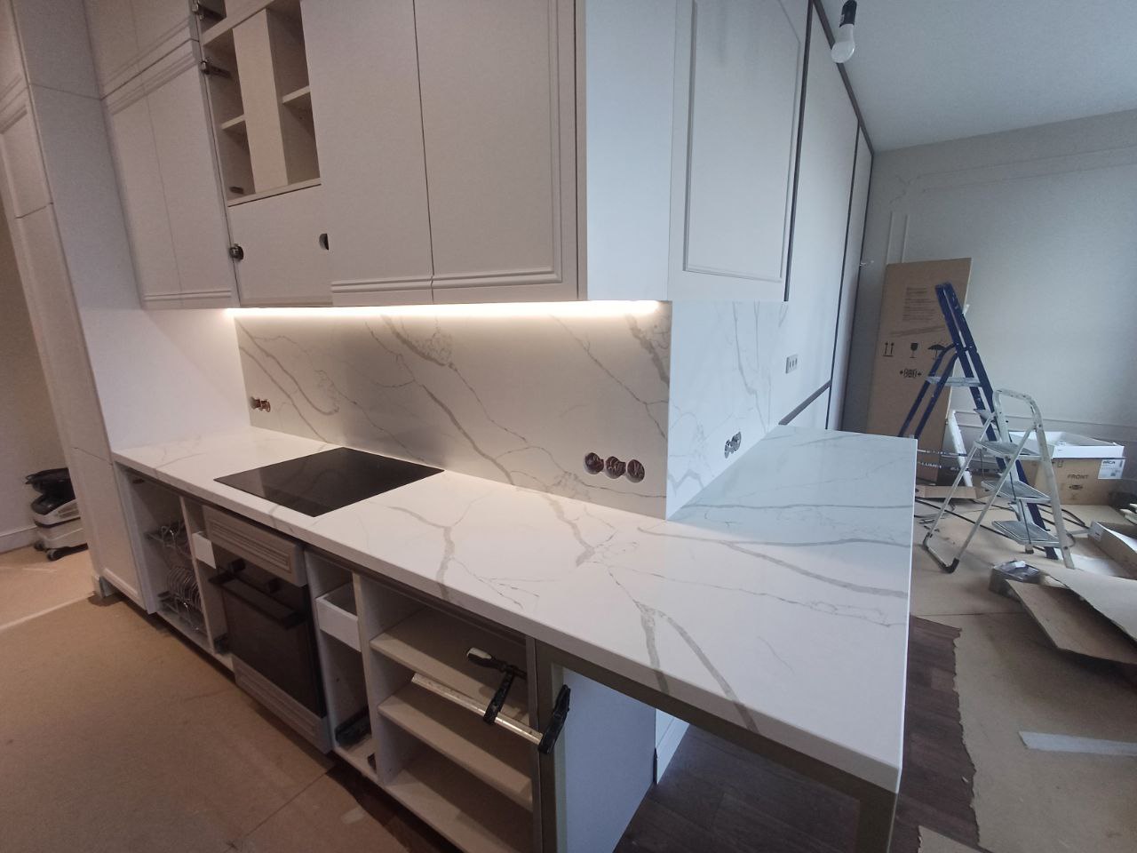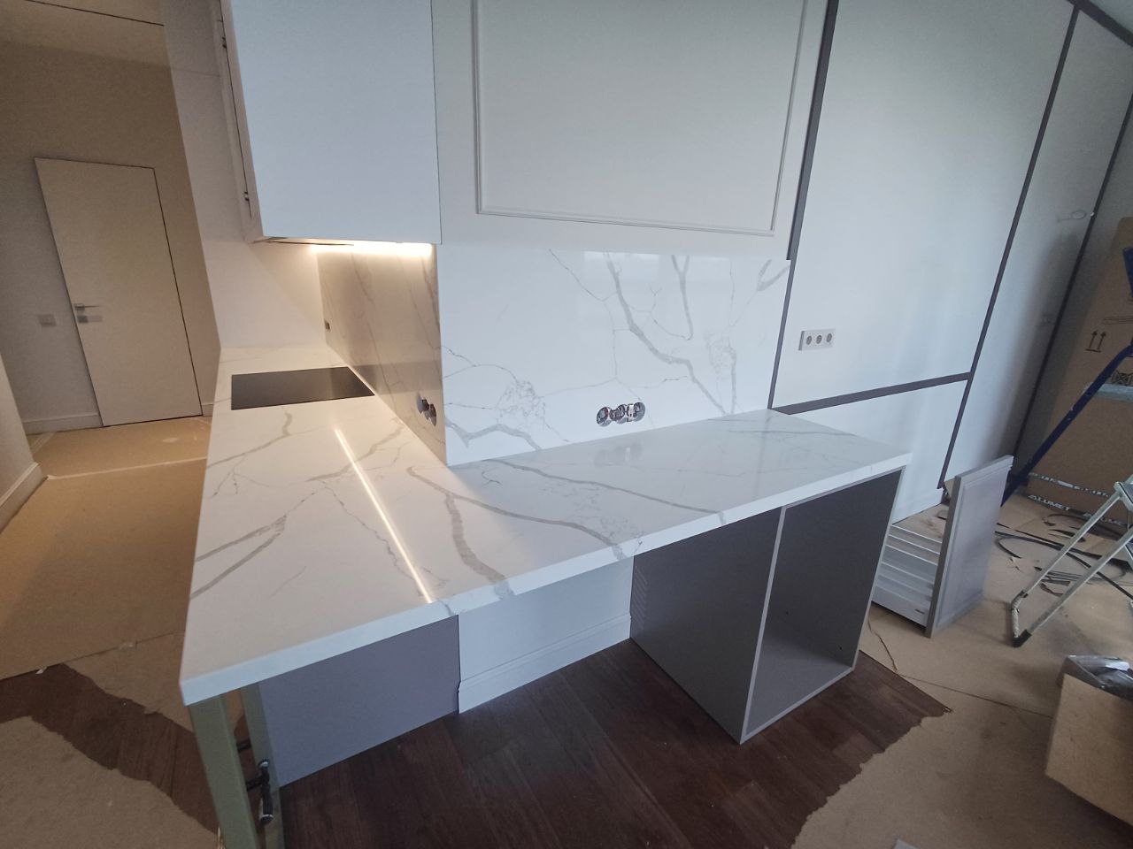 Реализованный проект демонстрирует удачное сочетание нестандартной планировки и выразительного дизайна материала. Столешница из кварца с рисунком Calacatta не только органично вписалась в интерьер светлой кухни, но и стала его смысловым центром. Проект подтвердил, что даже в монохромном пространстве можно создать яркий акцент за счет фактурного материала и продуманной конфигурации рабочих поверхностей.
