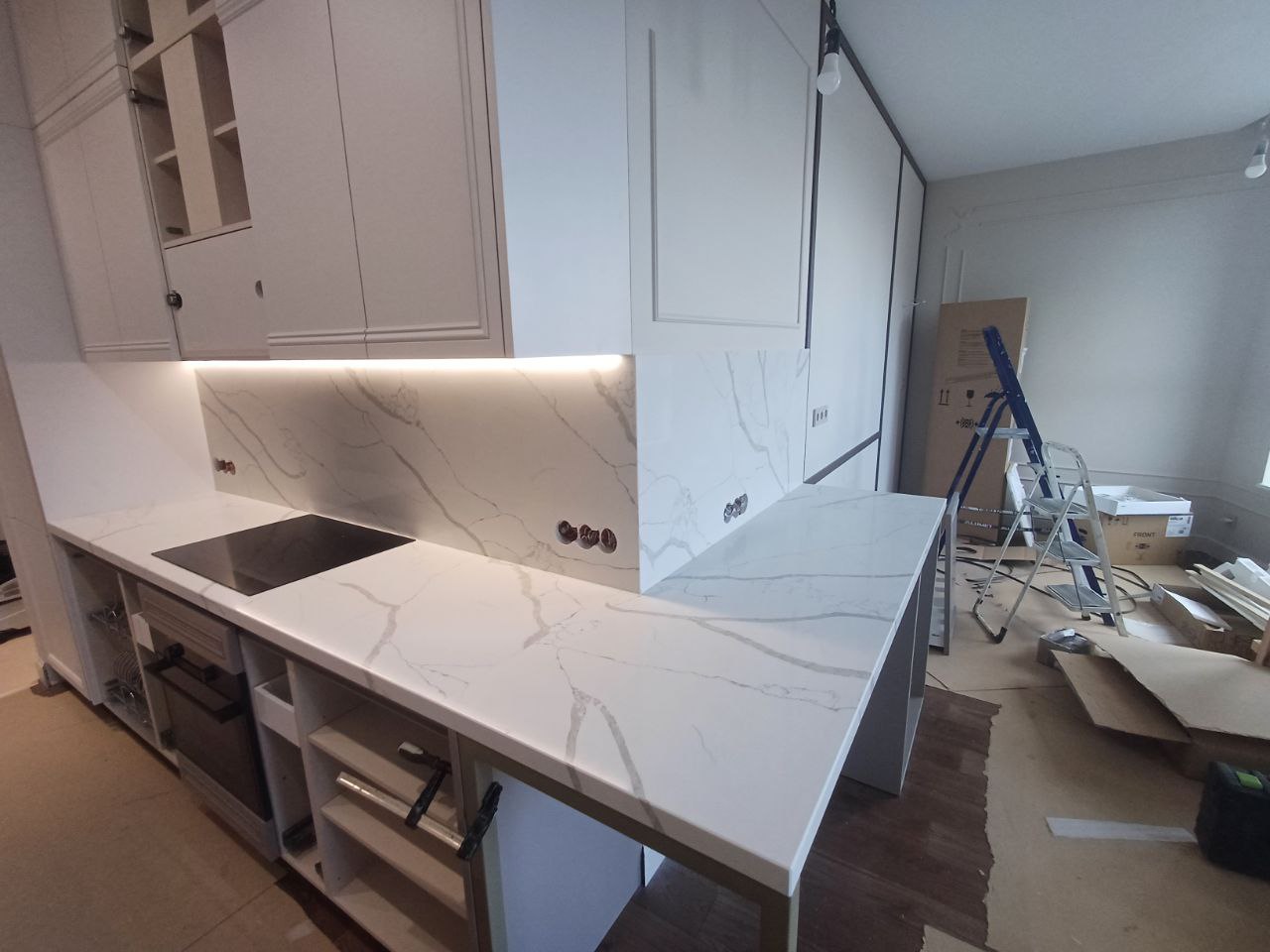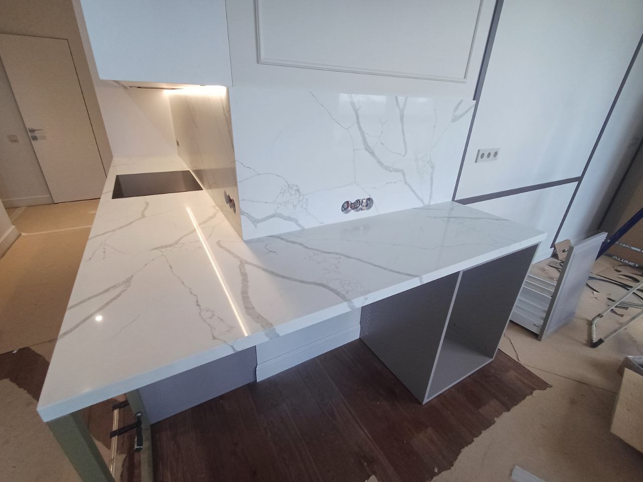 Ключевой особенностью проекта стала нестандартная Г-образная форма, где столешница огибает внешний угол кухни, создавая удобную рабочую зону. Рисунок в стиле Calacatta с яркими серыми зигзагами стал активным элементом интерьера, контрастирующим с матовыми белыми фасадами. Такое решение позволило визуально разграничить пространство, сохранив при этом общую светлую гамму помещения.