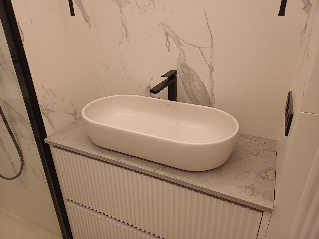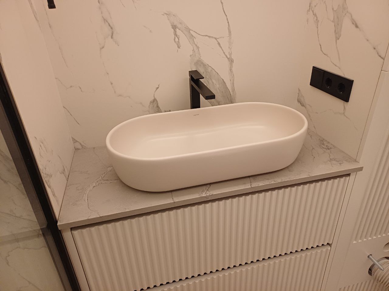 Ванная комната преобразилась благодаря удачному сочетанию функциональности и эстетики. Установленная столешница не только обеспечила практичность использования, но и стала художественным элементом интерьера. Проект подтвердил, что даже в компактном пространстве можно создать выразительную композицию с помощью качественных материалов и продуманного дизайна.