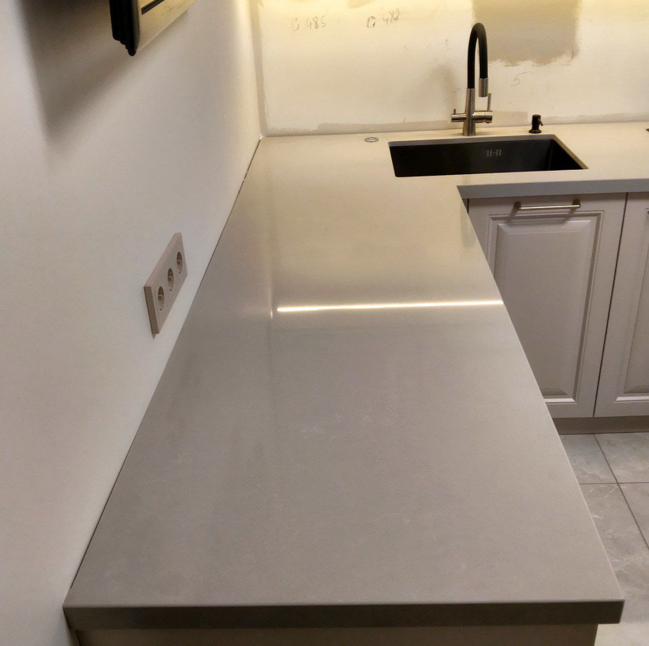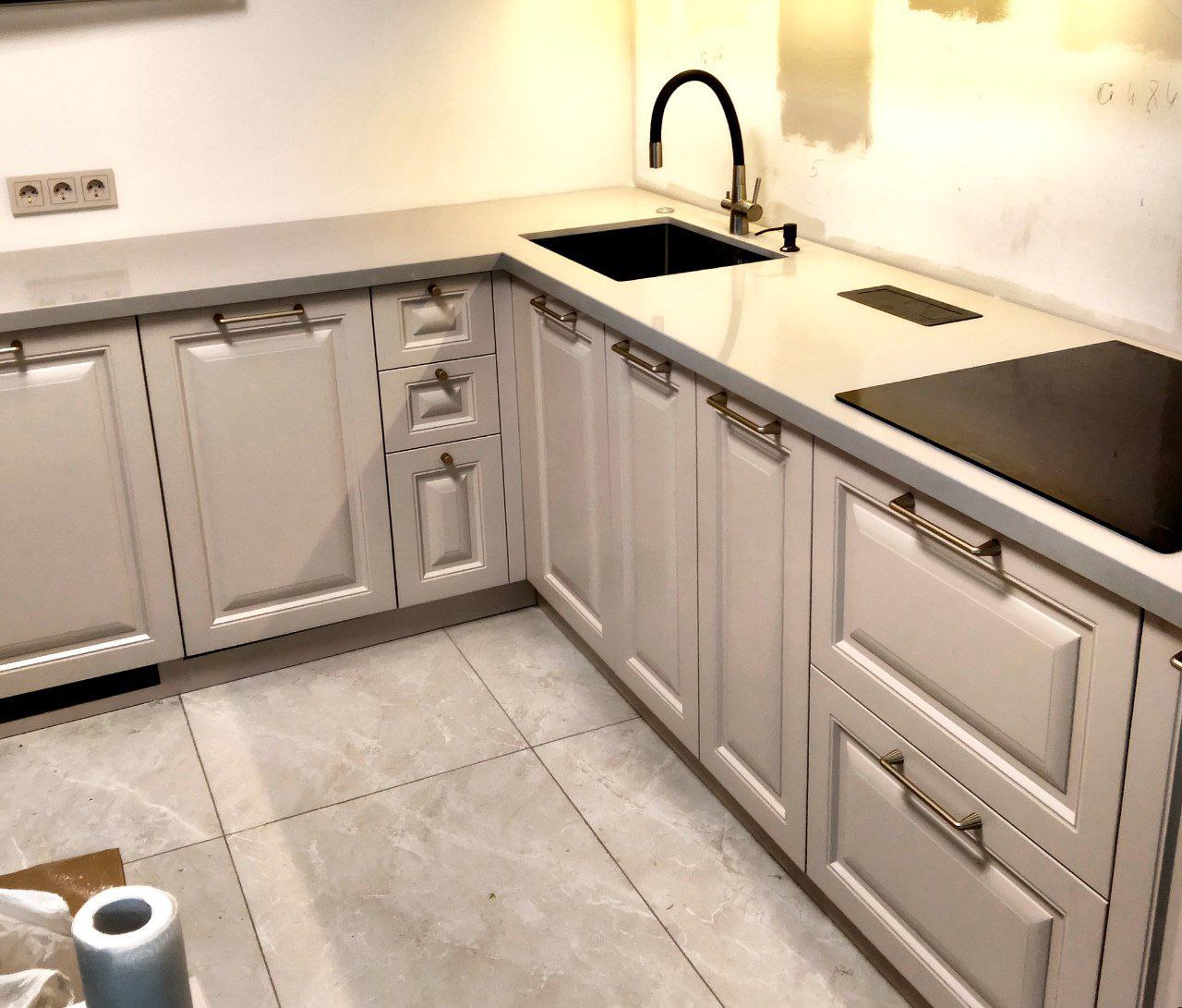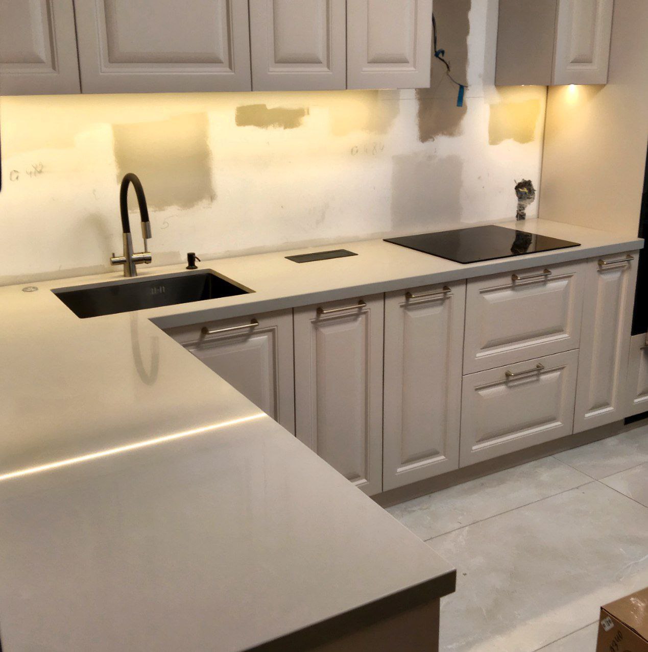 Ключевой идеей проекта стало создание визуально легкого и единого пространства, где столешница и фасады выступают в роли равноправных элементов общей светлой палитры. Глянцевая однотонная поверхность столешницы из кварца создает интересный контраст с матовой текстурой кухонных фасадов, сохраняя ощущение монолитности. Г-образная форма органично вписывается в помещение, усиливая чувство простора и порядка, а отсутствие фартука делает линии интерьера еще более чистыми и современными.