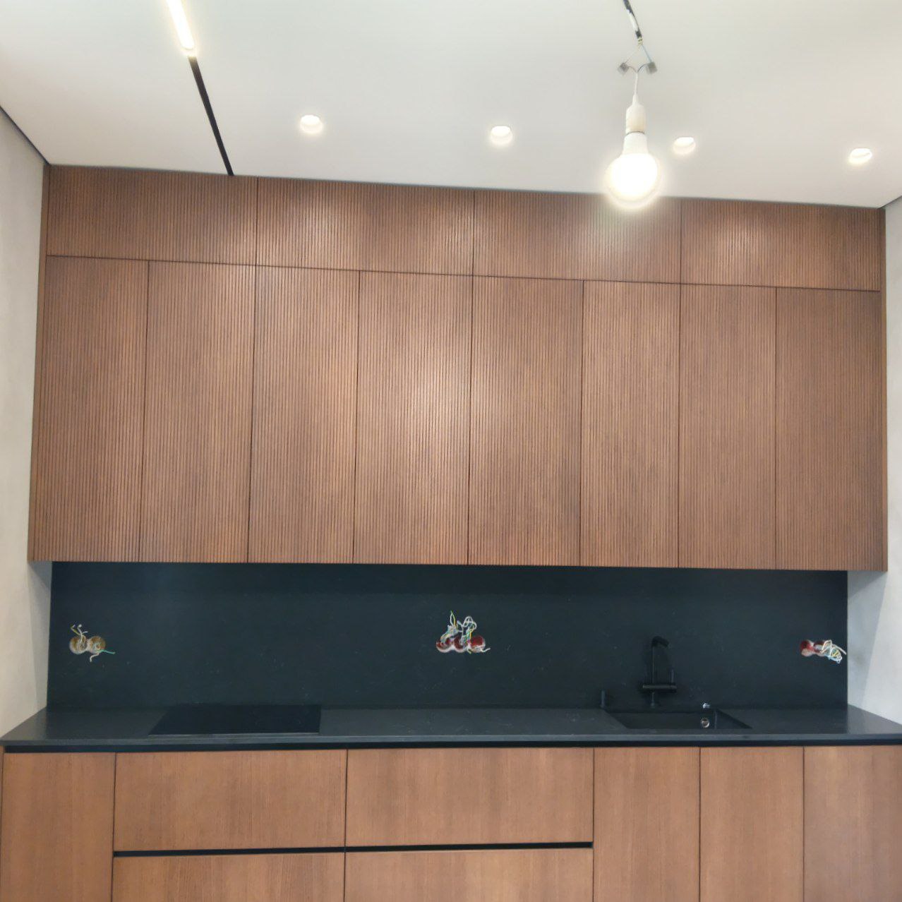 Кухня приобрела индивидуальный и законченный облик благодаря удачному сочетанию контрастных материалов. Темная столешница из кварца выгодно оттеняет природную красоту деревянных фасадов, создавая современный и в то же время уютный интерьер. Проект демонстрирует, как контраст цветов и текстур может стать основой для создания гармоничного и стильного пространства.