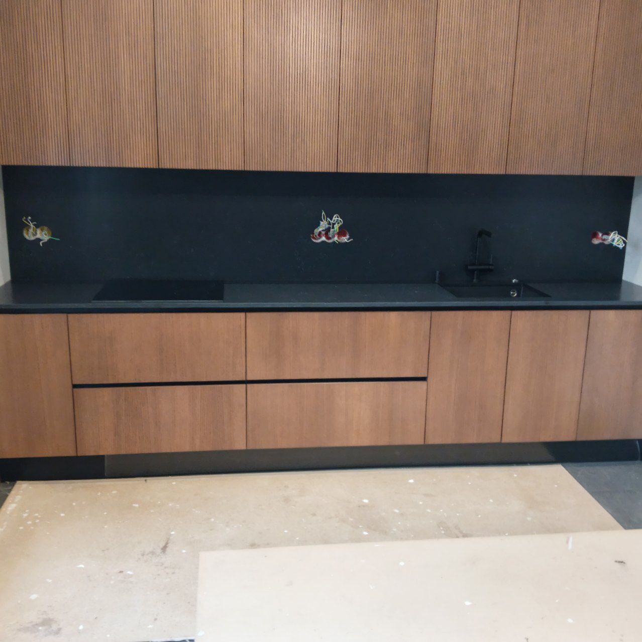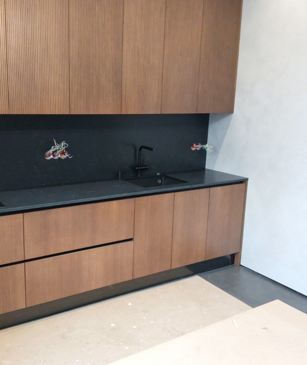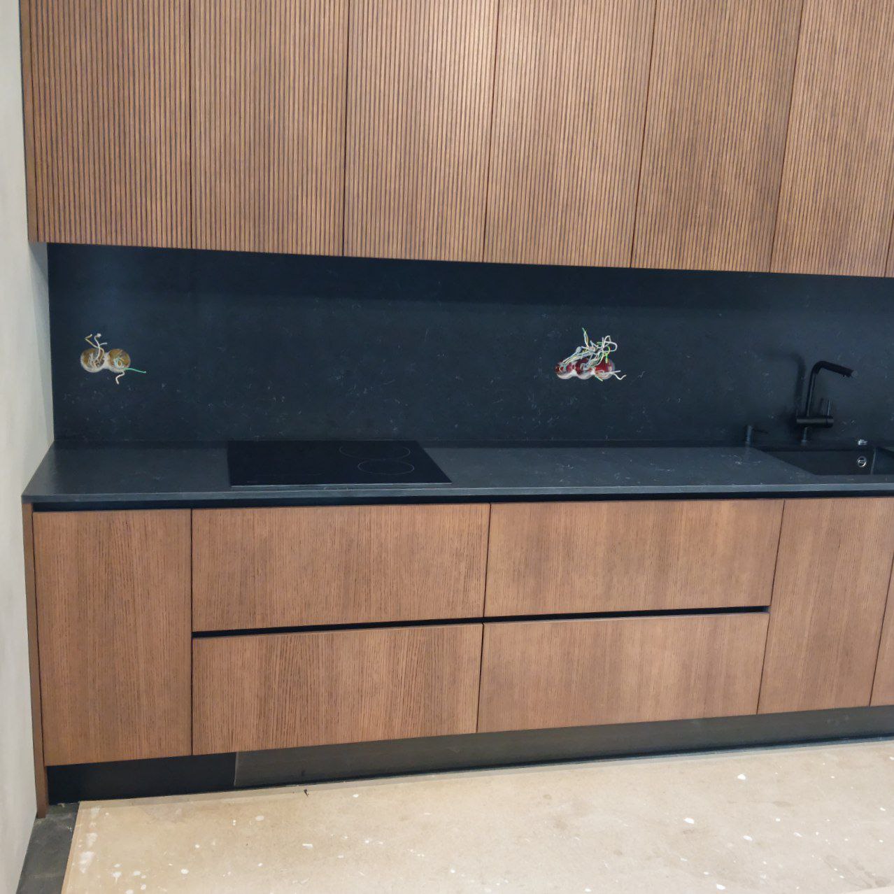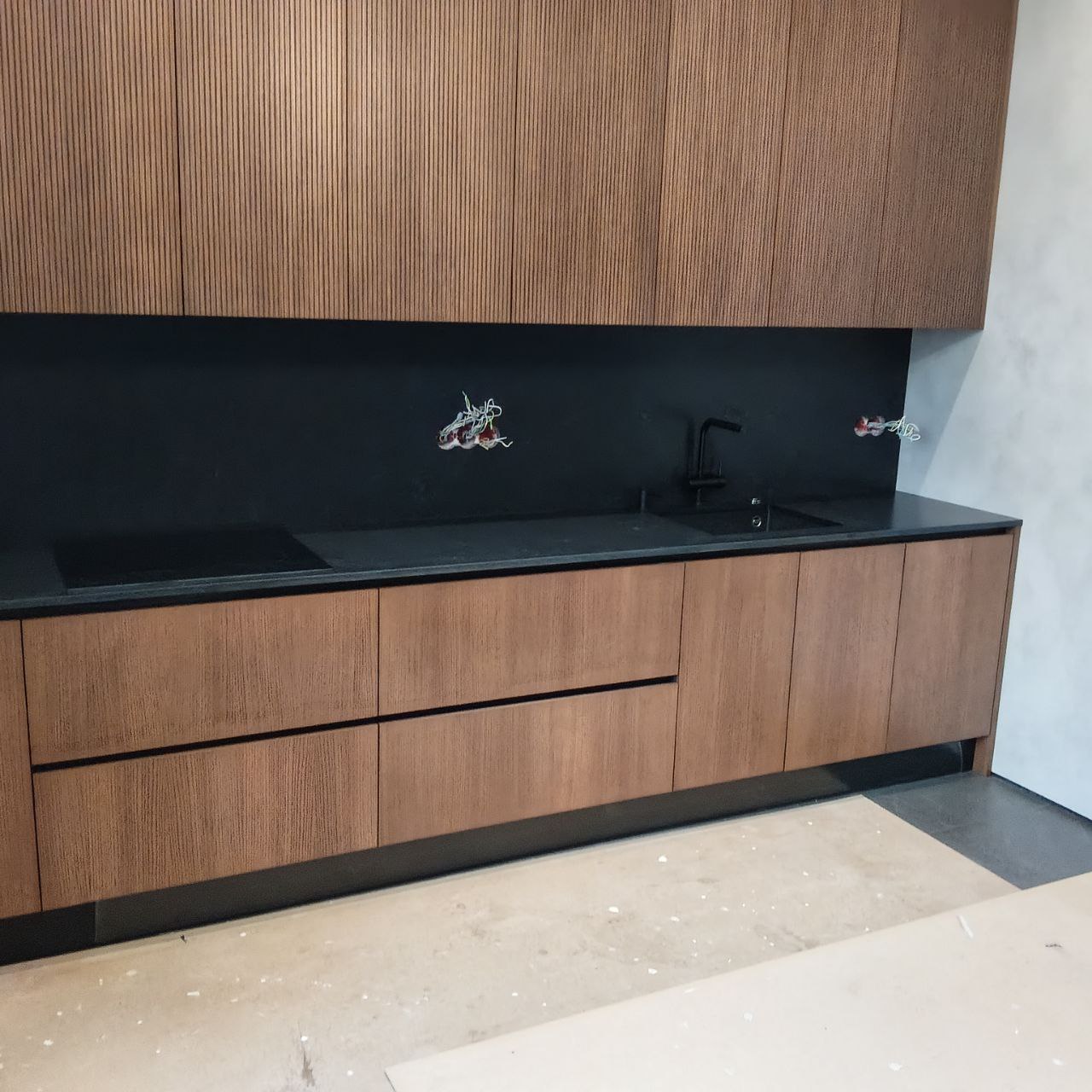 Интерьер построен на выразительном сочетании глубокого темного кварца и теплой текстуры натурального дерева. Продольная кварцевая столешница с матовой поверхностью создает эффектный контраст с деревянными фасадами, при этом оба материала гармонично дополняют друг друга, создавая сбалансированное и стильное пространство.