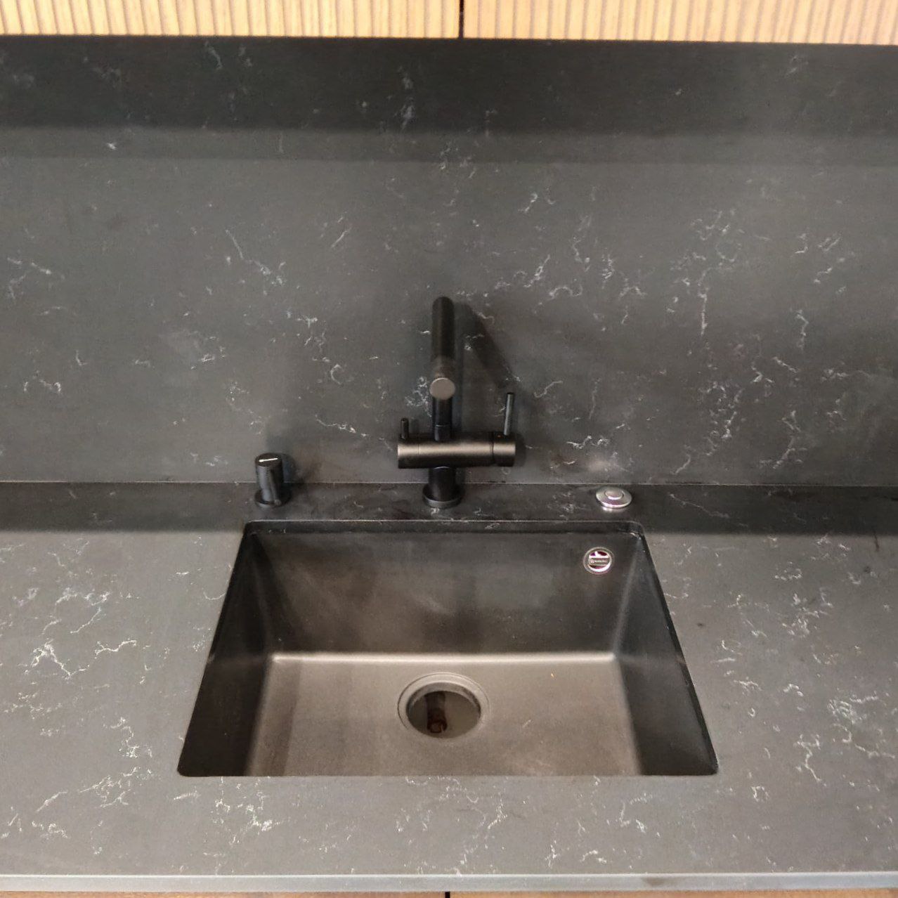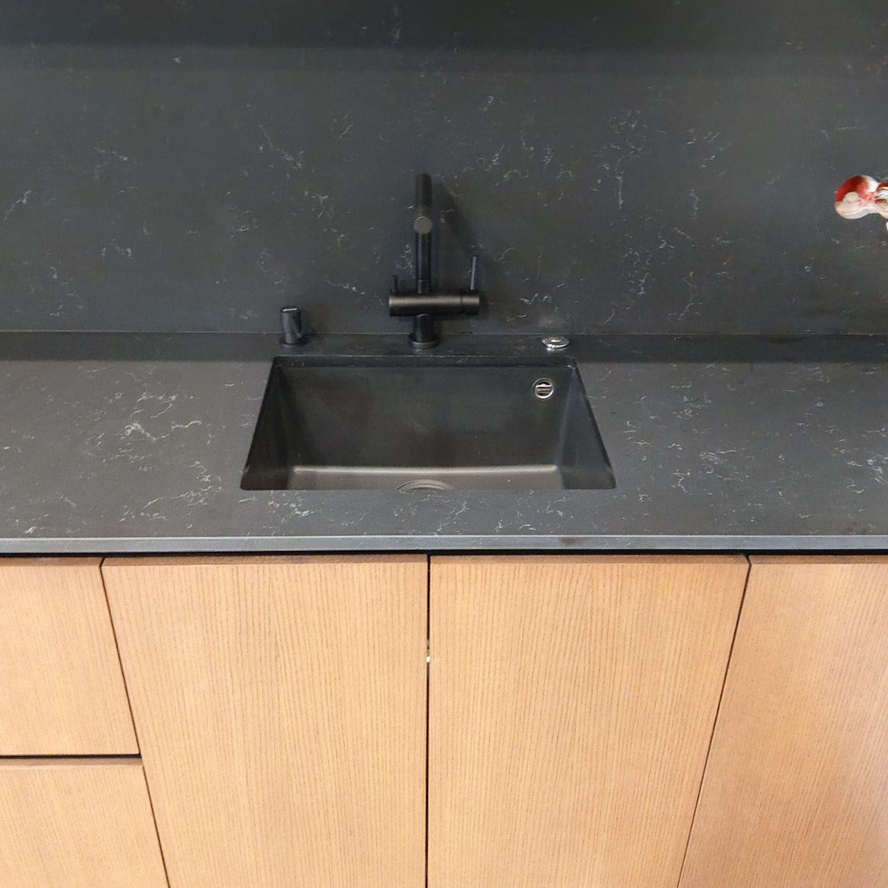 - Теплота натурального дерева смягчает строгость темного кварца, создавая уютную атмосферу.