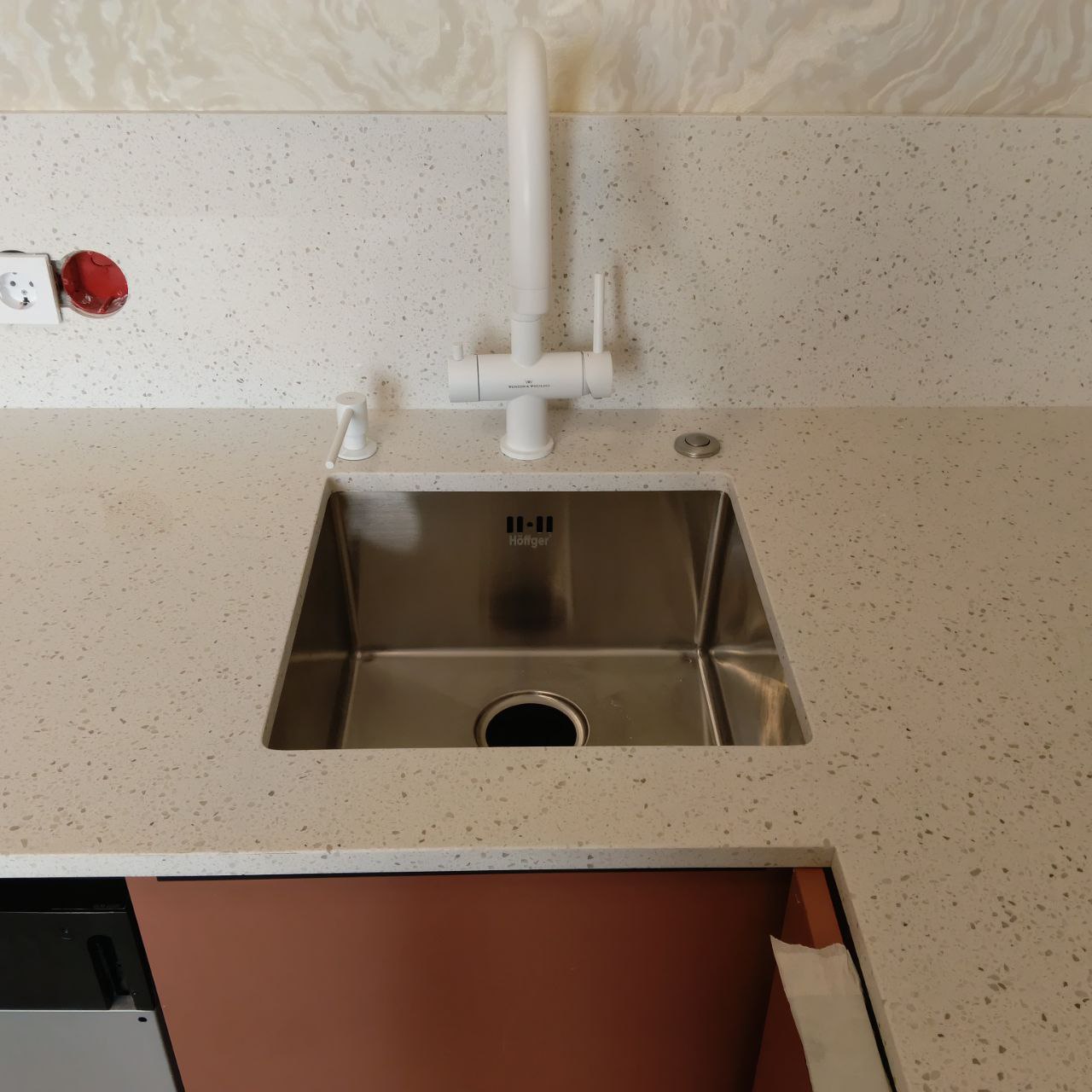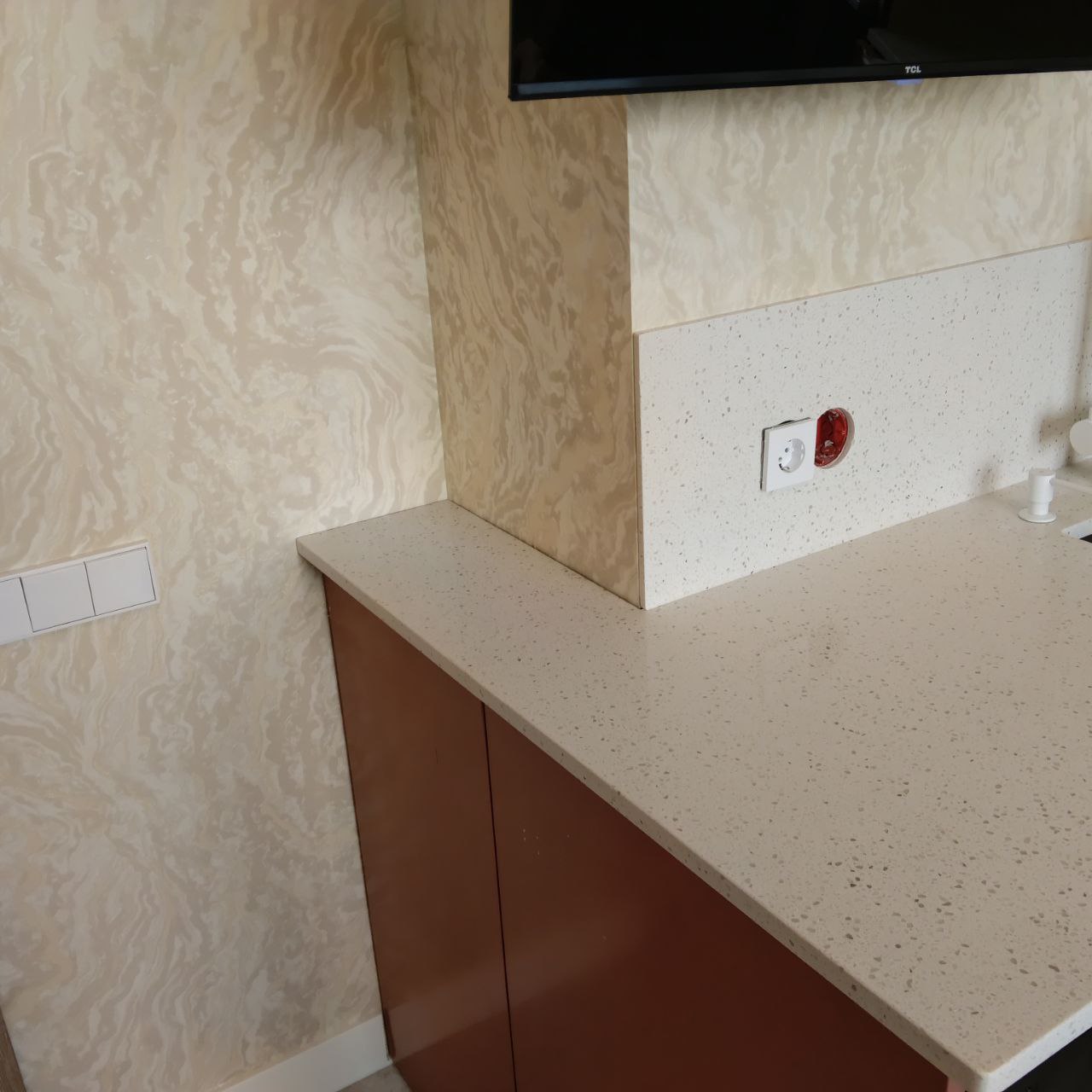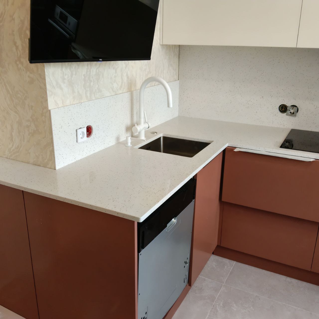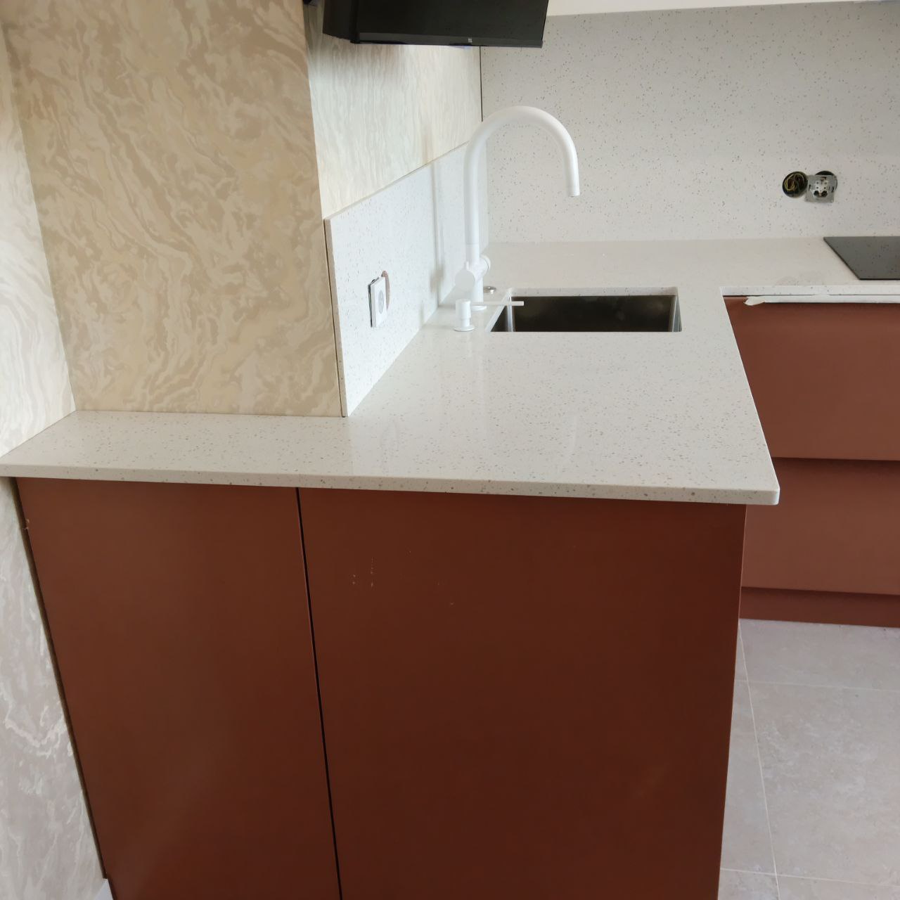 Кварцевая столешница в стилистике «соль-перец» с минималистичным дизайном объединила эргономику и визуальную динамику.