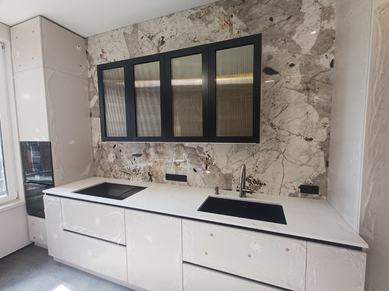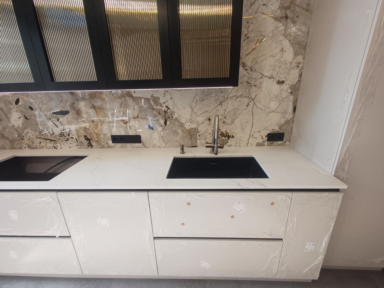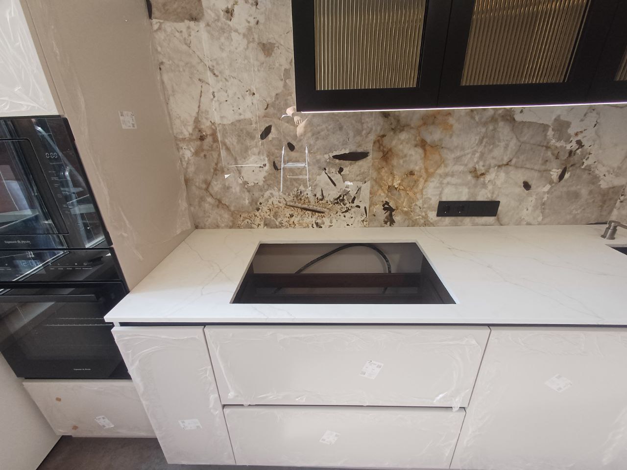 Данный проект реализует гармоничное сочетание минималистичной белой столешницы и роскошного фартука в стиле Calacatta, создавая кухню, где современные технологии встречаются с классической эстетикой.