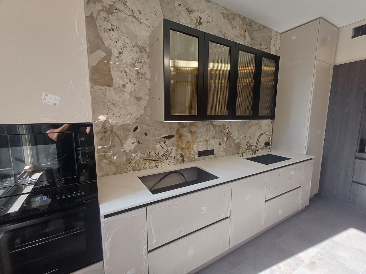 - Фартук: Высокий фартук на всю стену из кварцевого агломерата Calacatta Gold. Его уникальный рисунок напоминает прожилки итальянского мрамора: мягкие золотисто-серые разводы на молочно-белом фоне создают динамичный и глубокий визуальный эффект. Каждый участок поверхности неповторим благодаря хаотичным, но изысканным вкраплениям.