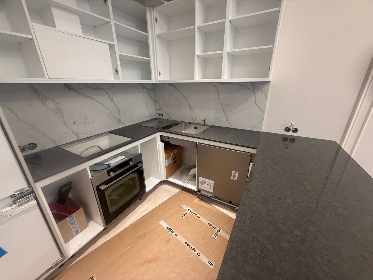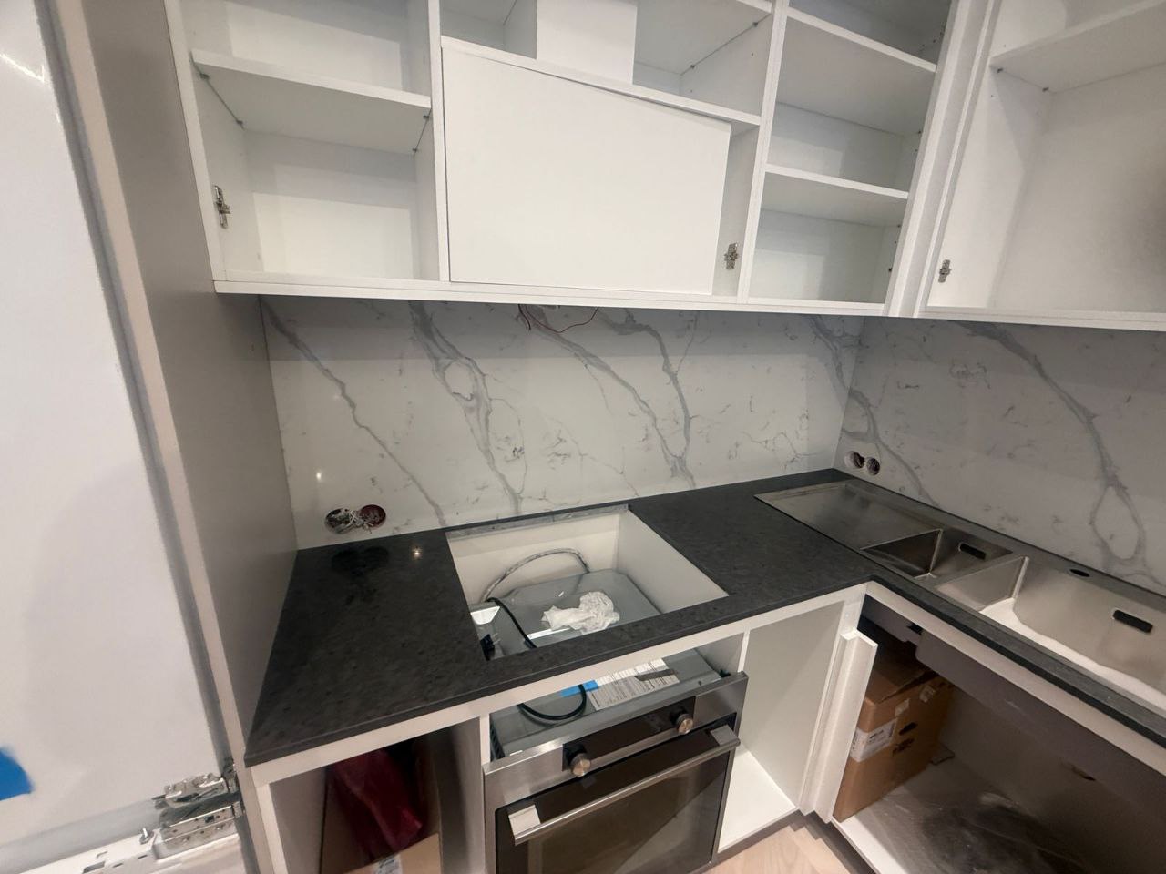 В результате была реализована комплексная работа по оснащению кухни. Установленная столешница из кварца обладает высокой износостойкостью и гигиеничностью, а контрастный фартук визуально расширяет пространство и добавляет интерьеру роскоши. Все технические нюансы, включая подготовку под встраиваемую технику, были учтены, что обеспечило не только безупречный внешний вид, но и долговечность эксплуатации. Проект демонстрирует, как грамотное сочетание материалов и точный инжиниринг позволяют создать идеальное кухонное пространство.