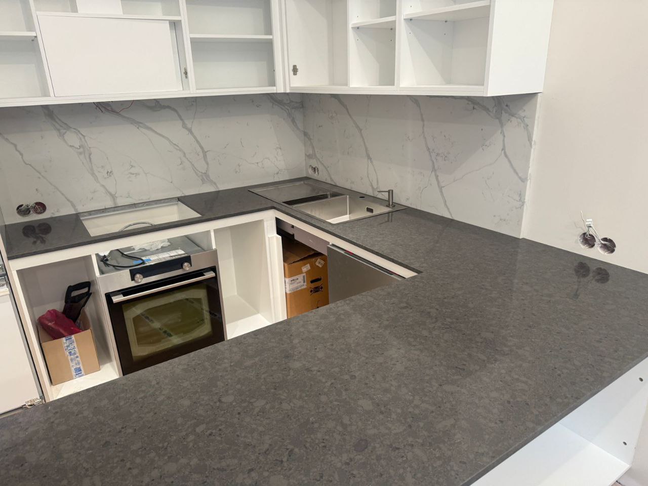 - П-образная столешница из кварца матового серого цвета, обеспечивающая просторную рабочую зону;