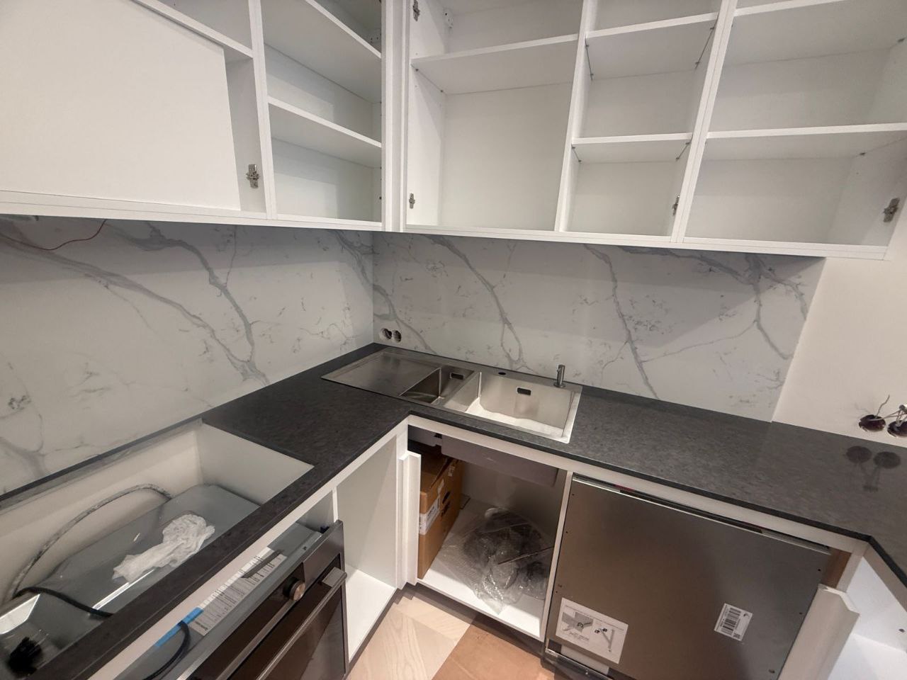 Для создания яркого акцента был выбран фартук из кварцевого агломерата, имитирующий популярный мрамор Calacatta. Его изготовление потребовало внимания к деталям: